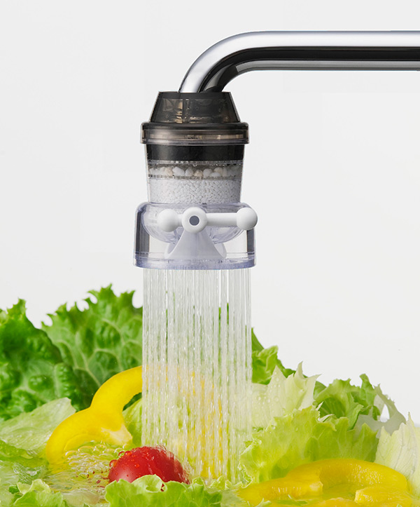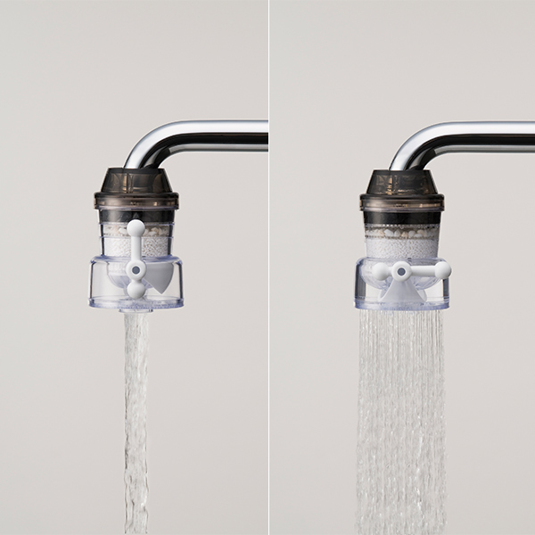 自在水栓の浄水器です。ゴミ・鉄サビを除去し、備長炭が水をおいしくクリーンにします。90度のハンドル操作で水流を簡単に切り替えられます。