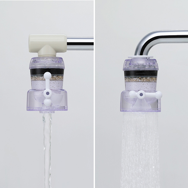 活性炭・サンゴ化石・亜硫酸カルシウムの多重ろ過で浄水し、ゴミ・鉄さびを除去します。クリーンな水を自宅のキッチンで味わうことができます。90度のハンドル操作で水流を簡単に切り替えられます。