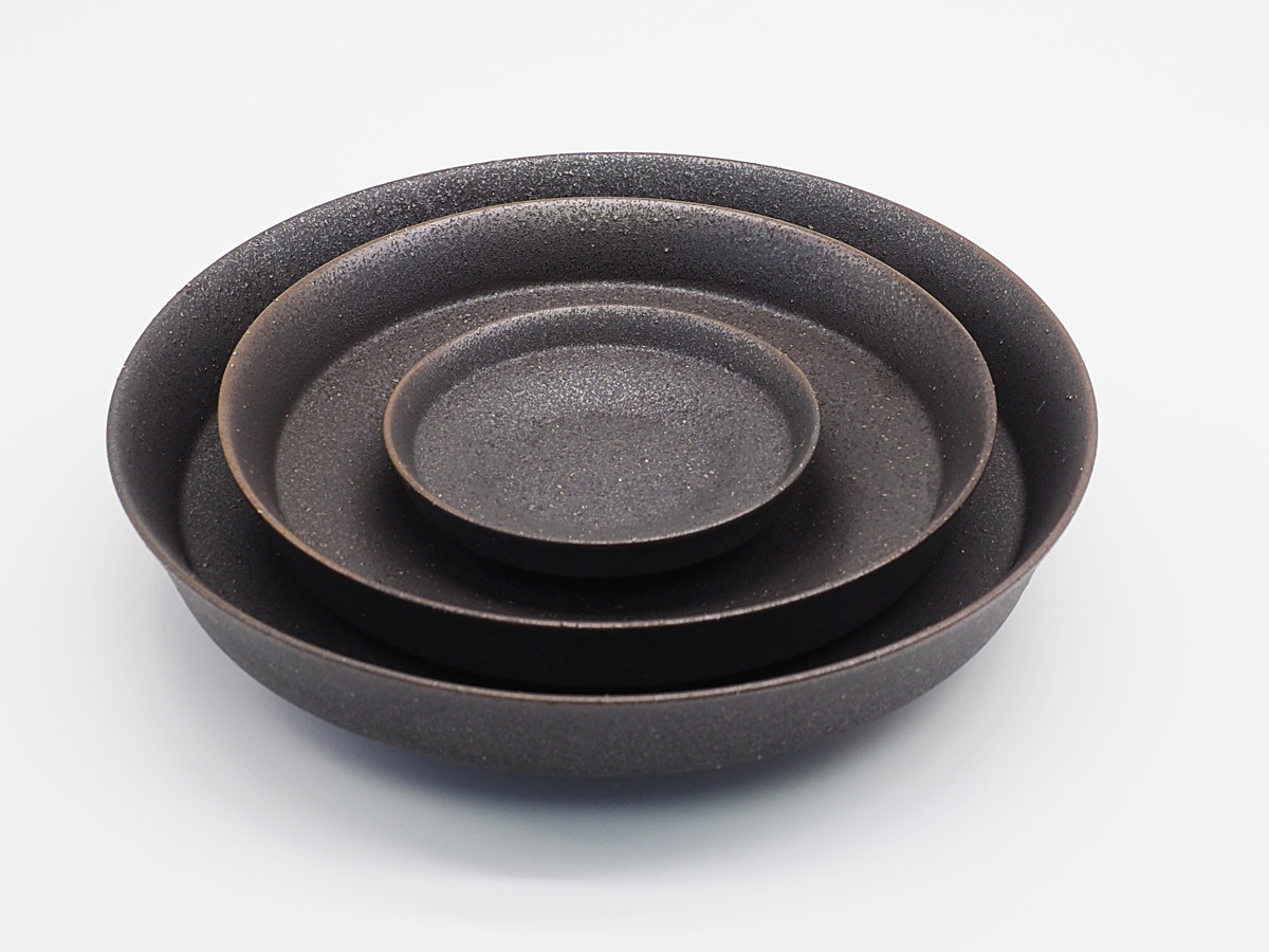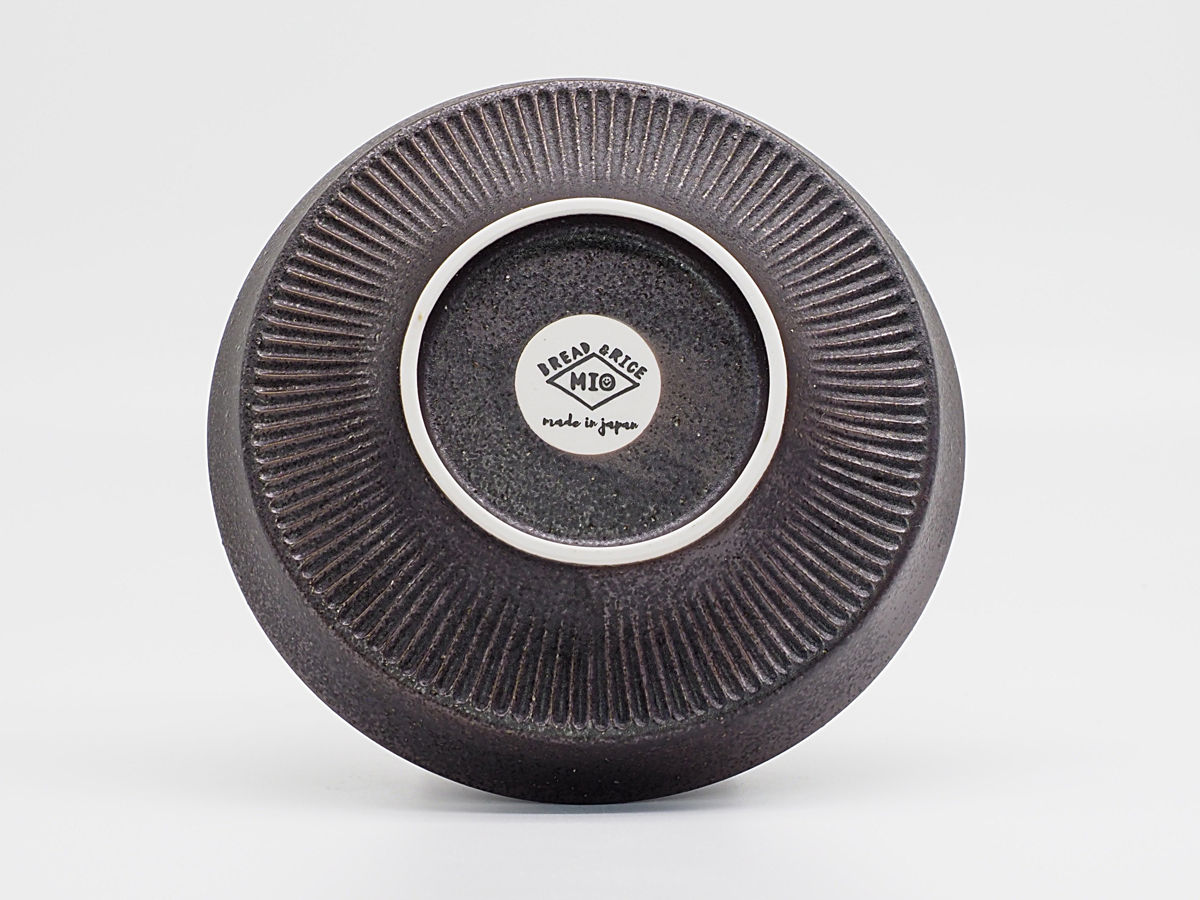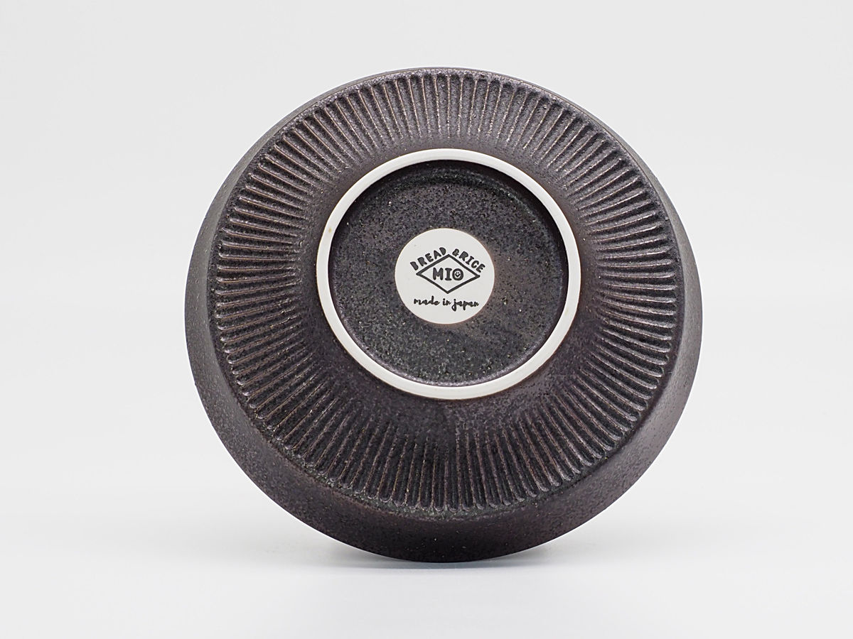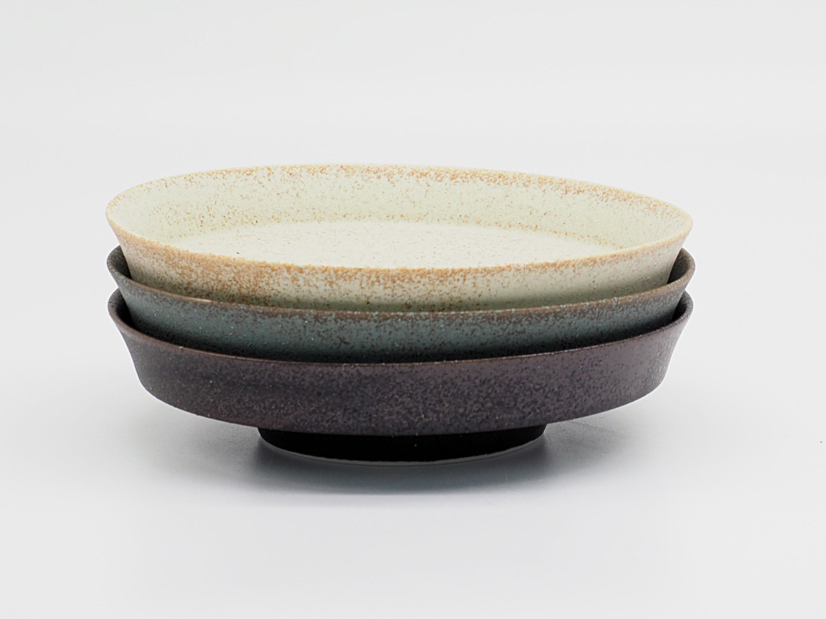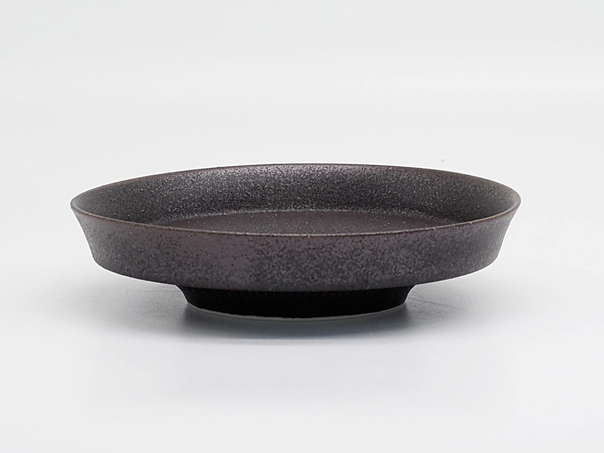 底が少し凹んだ特殊な形状のお皿です。その凹みが自然と「ここに盛ろう」というガイドになり、盛り付けた料理がぐっと映えます。表面はザラッとした質感とシックな色合いで、和洋問わずどんな料理にも馴染みます。サラダ、炒め物、煮物、パスタの取り皿としてなど毎日の食卓で大活躍するMサイズです。