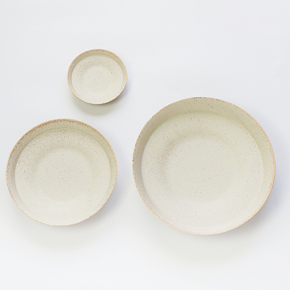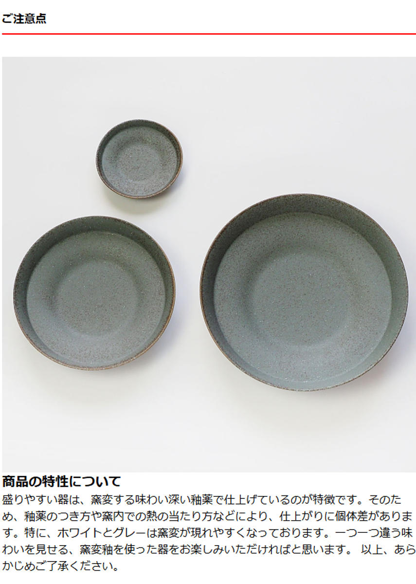 盛りやすい器は、窯変する味わい深い釉薬で仕上げているのが特徴です。そのため、釉薬のつき方や窯内での熱の当たり方などにより、仕上がりに個体差があります。特に、ホワイトとグレーは窯変が現れやすくなっております。一つ一つ違う味わいを見せる、窯変釉を使った器をお楽しみいただければと思います。以上、あらかじめご了承ください。