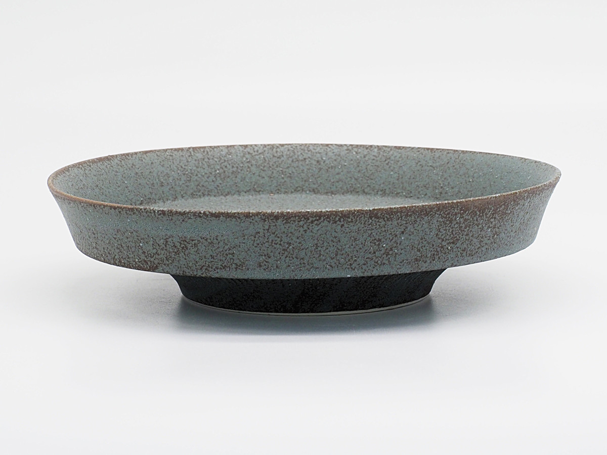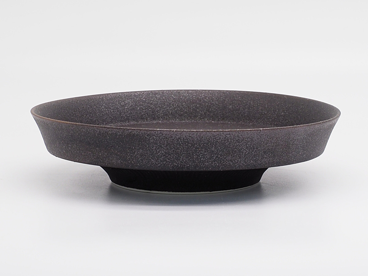 底が少し凹んだ特殊な形状のお皿です。その凹みが自然と「ここに盛ろう」というガイドになり、盛り付けた料理がぐっと映えます。表面はザラッとした質感とシックな色合いで、和洋問わずどんな料理にも馴染みます。カレーやパスタ、煮込み料理やワンプレートランチにも使えるLサイズです。