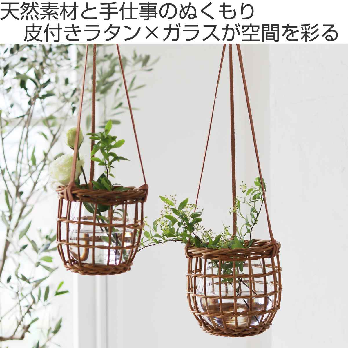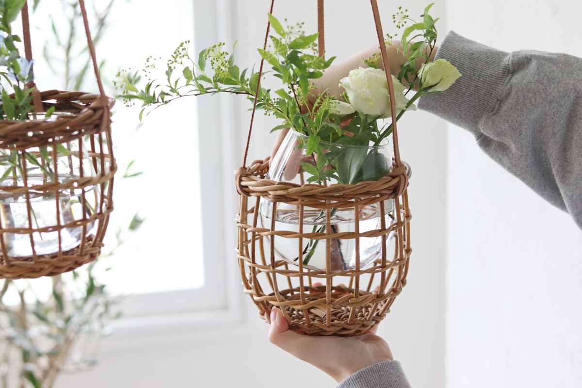 ラタンとガラスの2パーツに分かれているので、フックに吊るしたまま中の容器を取り出せます。ラタンを濡らすことなく水の入れ替えやお手入れが可能です。