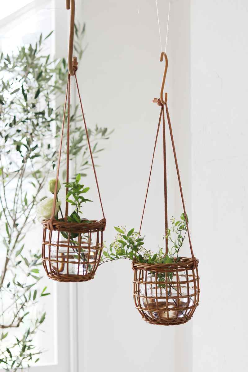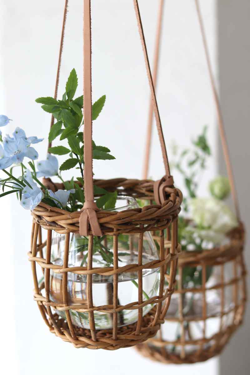 ラタンとガラスの2パーツに分かれているので、フックに吊るしたまま中の容器を取り出せます。ラタンを濡らすことなく水の入れ替えやお手入れが可能です。