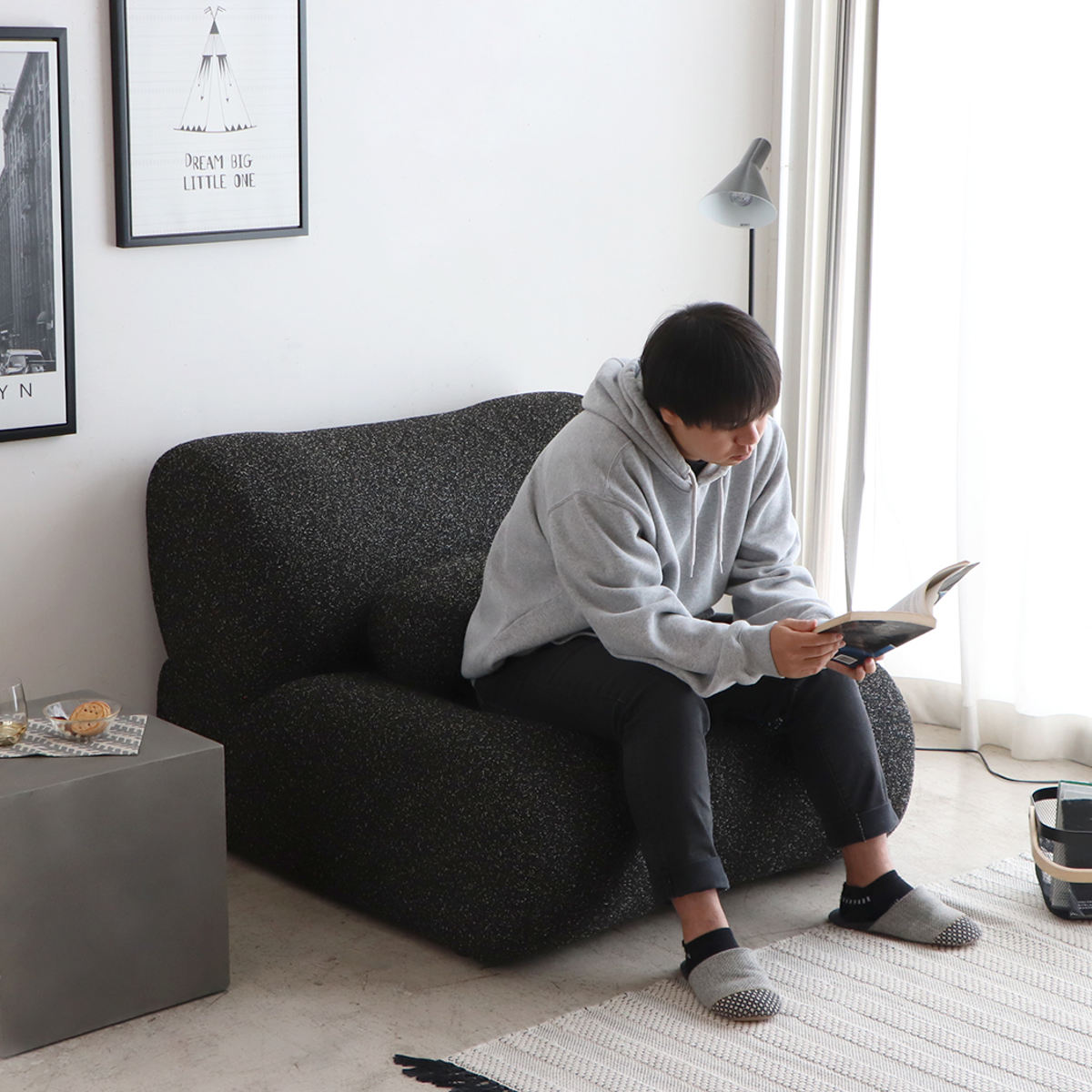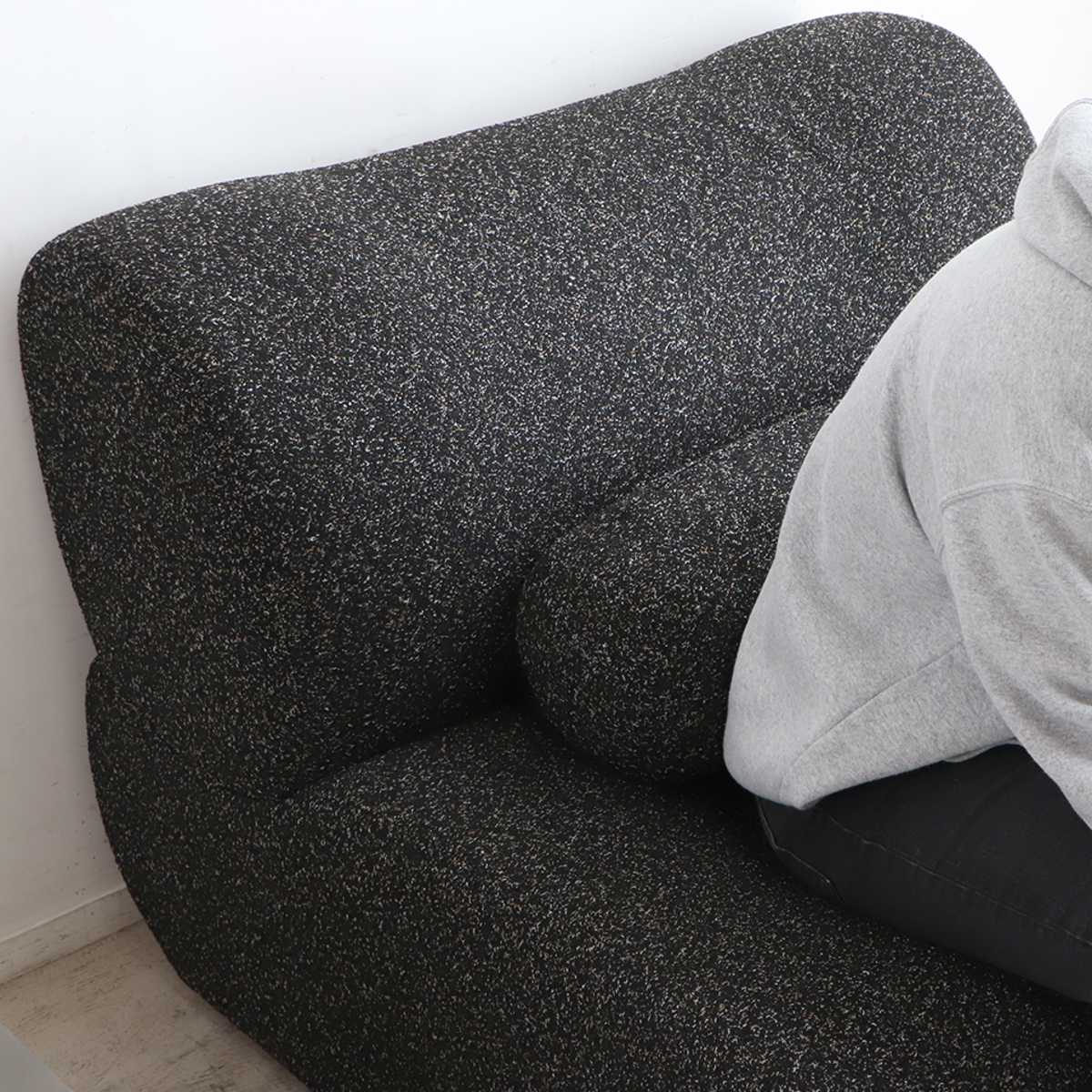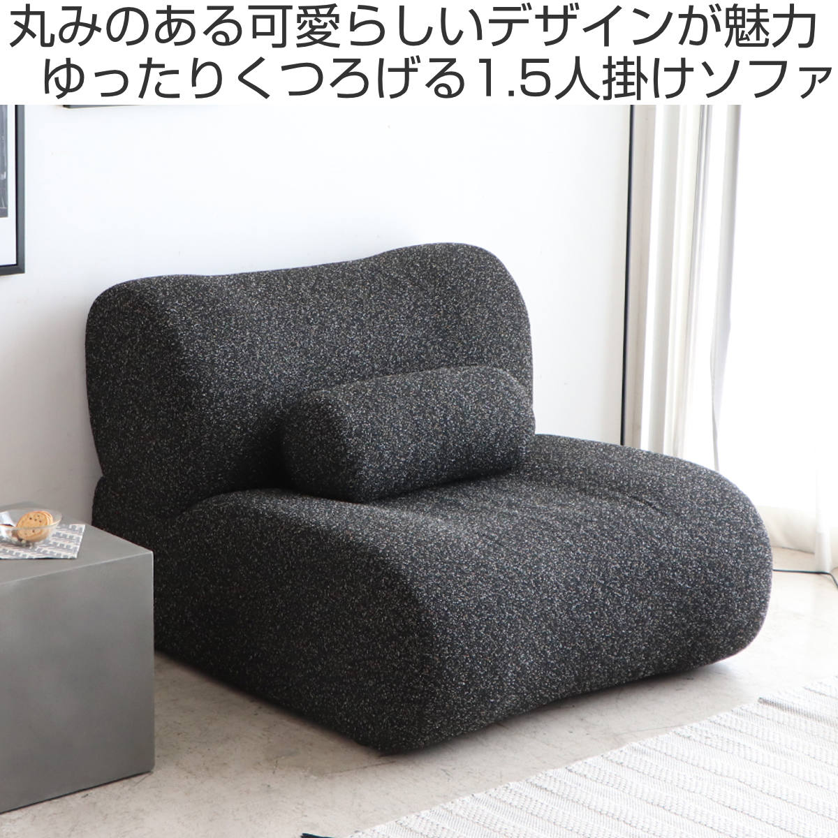 ふんわり包み込まれるような可愛らしいフォルム。自然と姿勢が安定する座り心地のよい1.5人掛けソファです。
