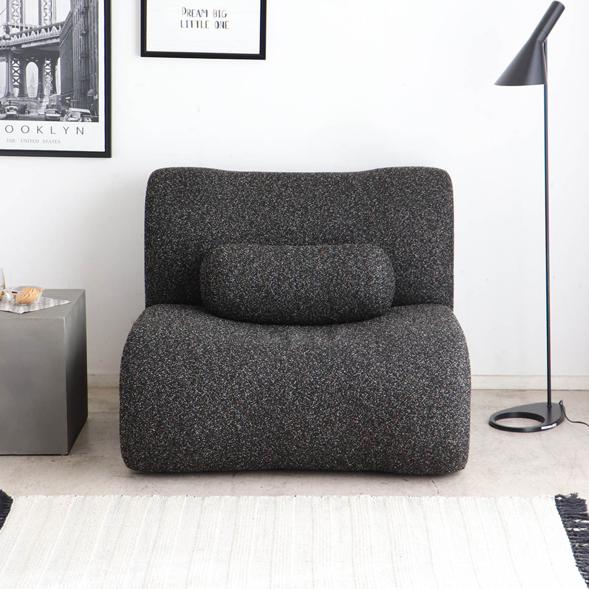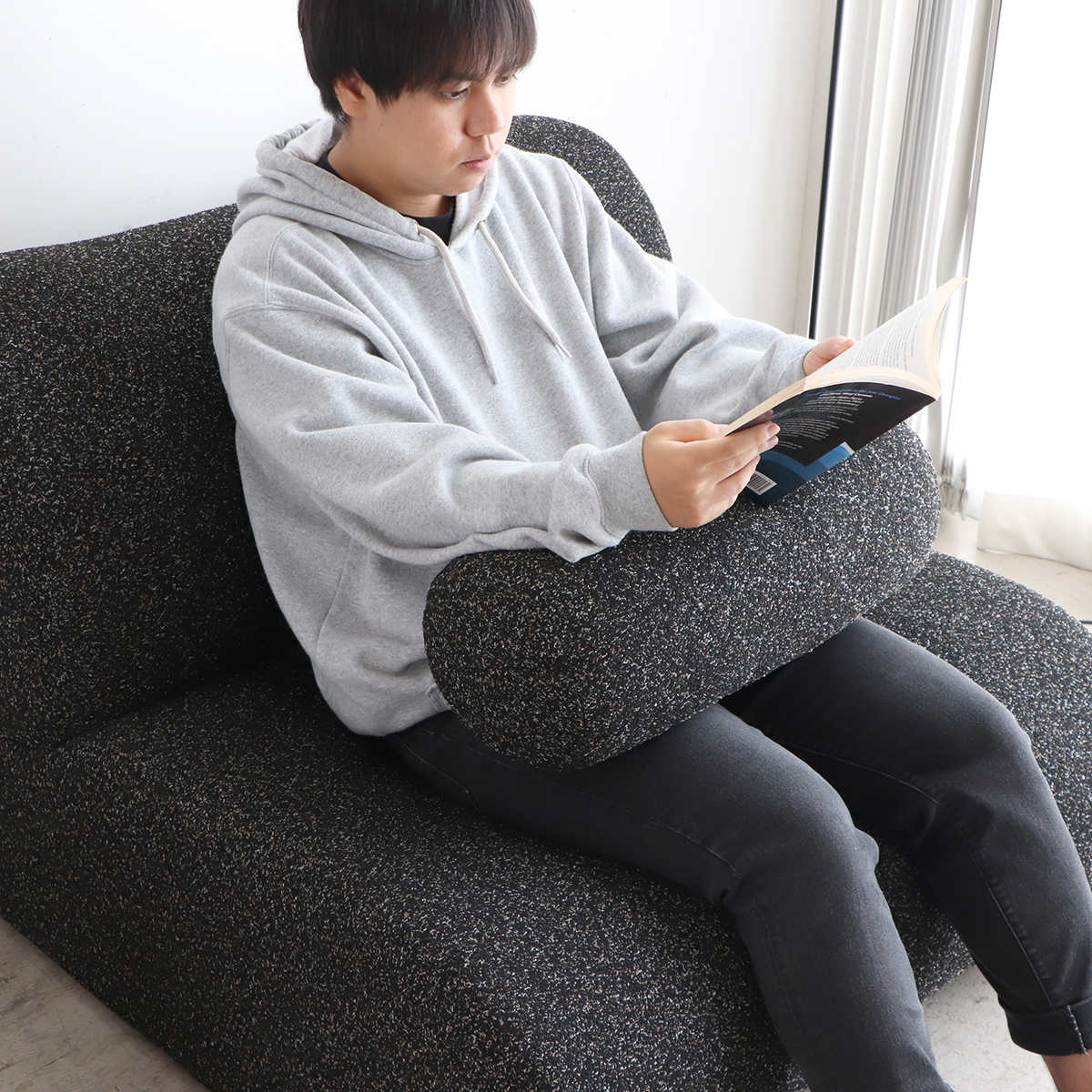 ソファ本体と同じ生地の統一感のあるデザインのクッション付きです。程よい弾力があるので、腰当てや肘置き、抱き枕としても使えるので万能です。