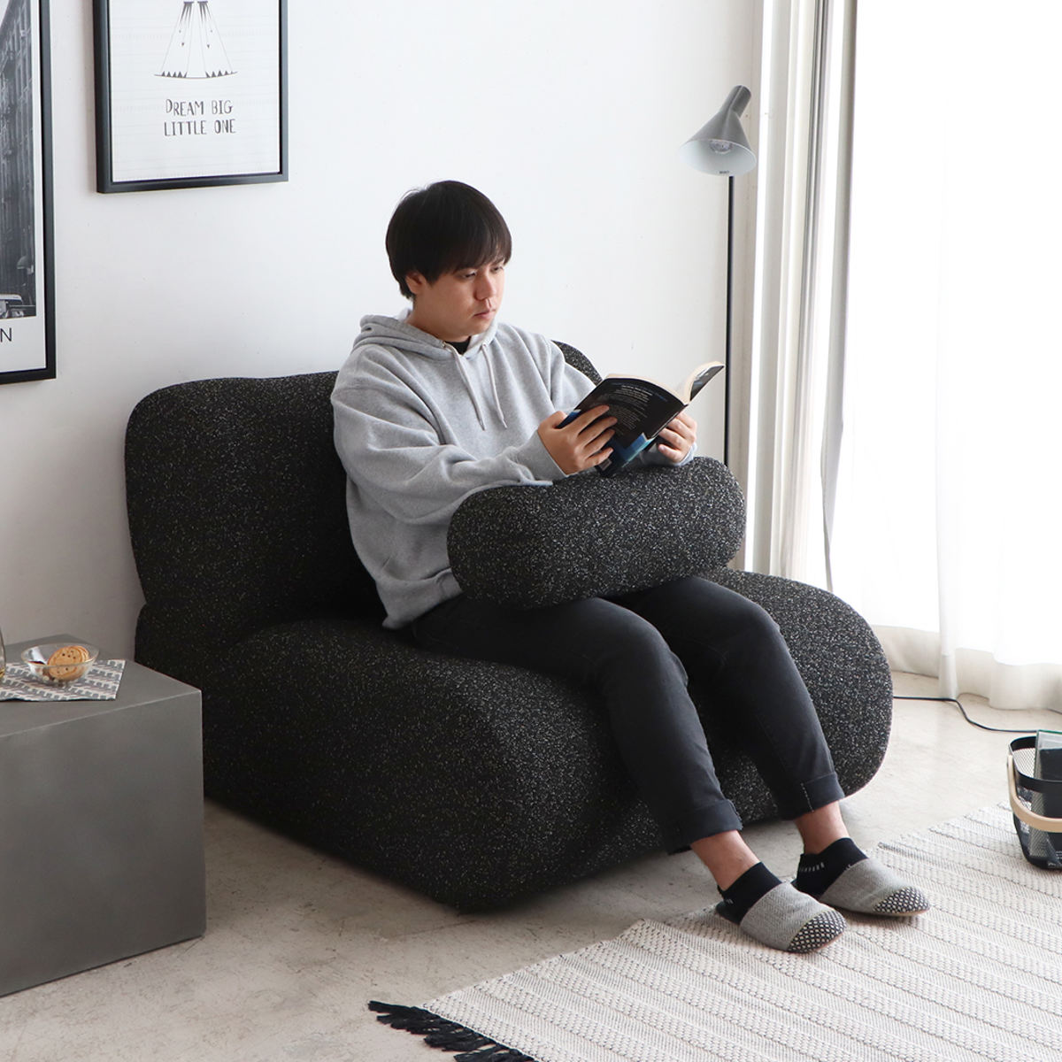 ひとりでゆったり座るのはもちろん、2台並べれば、2人でくつろげる心地よい空間に。お互いの距離をほどよく保ちながら、映画を観たり、会話を楽しんだりと自由な過ごし方ができます。