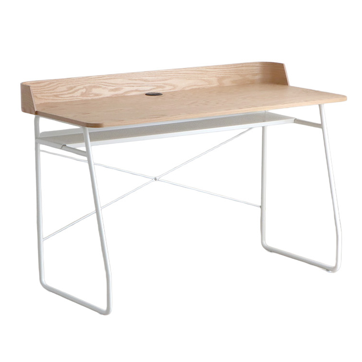 天板形状の沿わせた曲木が視覚的な集中力を高めてくれる効果をもたらします。また、背面に立ち上がりを設けることで、物が落ちにくく、壁際に設置してもすっきりまとまります。