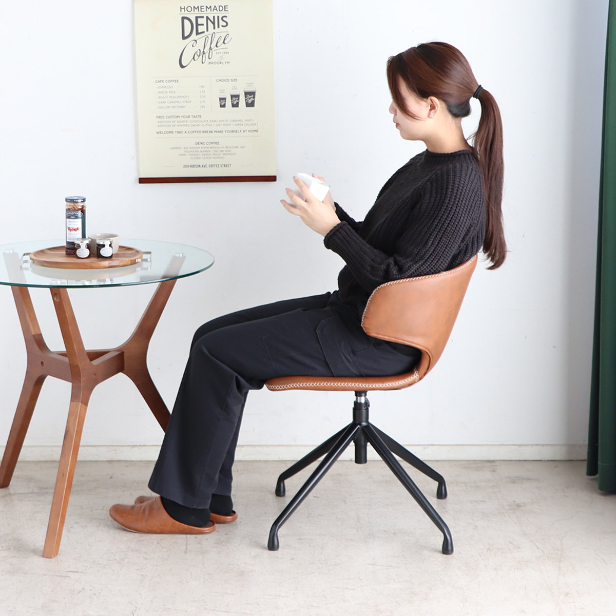 座面が360度回転するので、座ったまま自由に方向を変えられます。会話中やテーブル作業での向き替えに便利です。