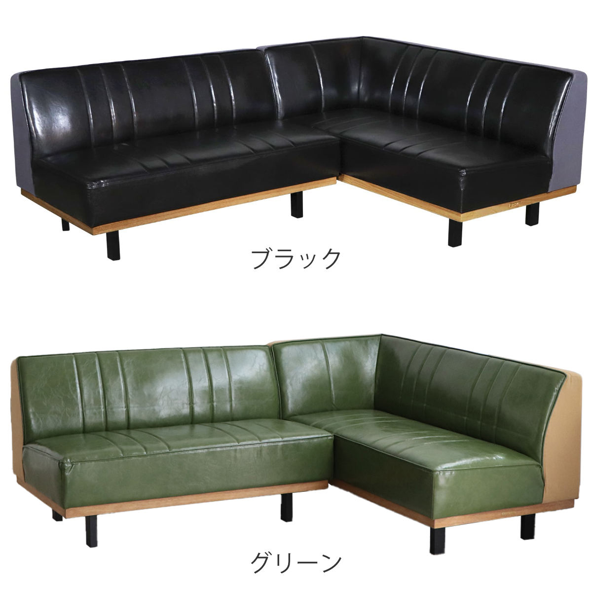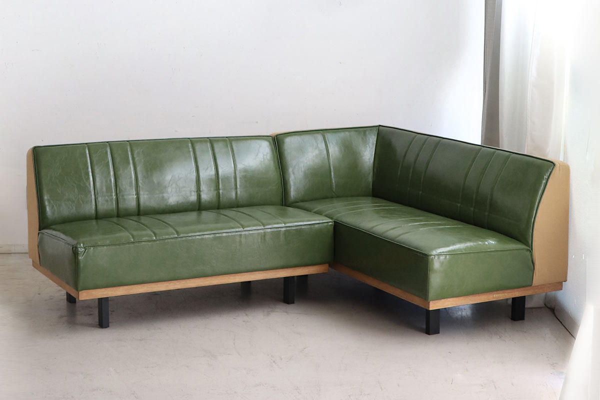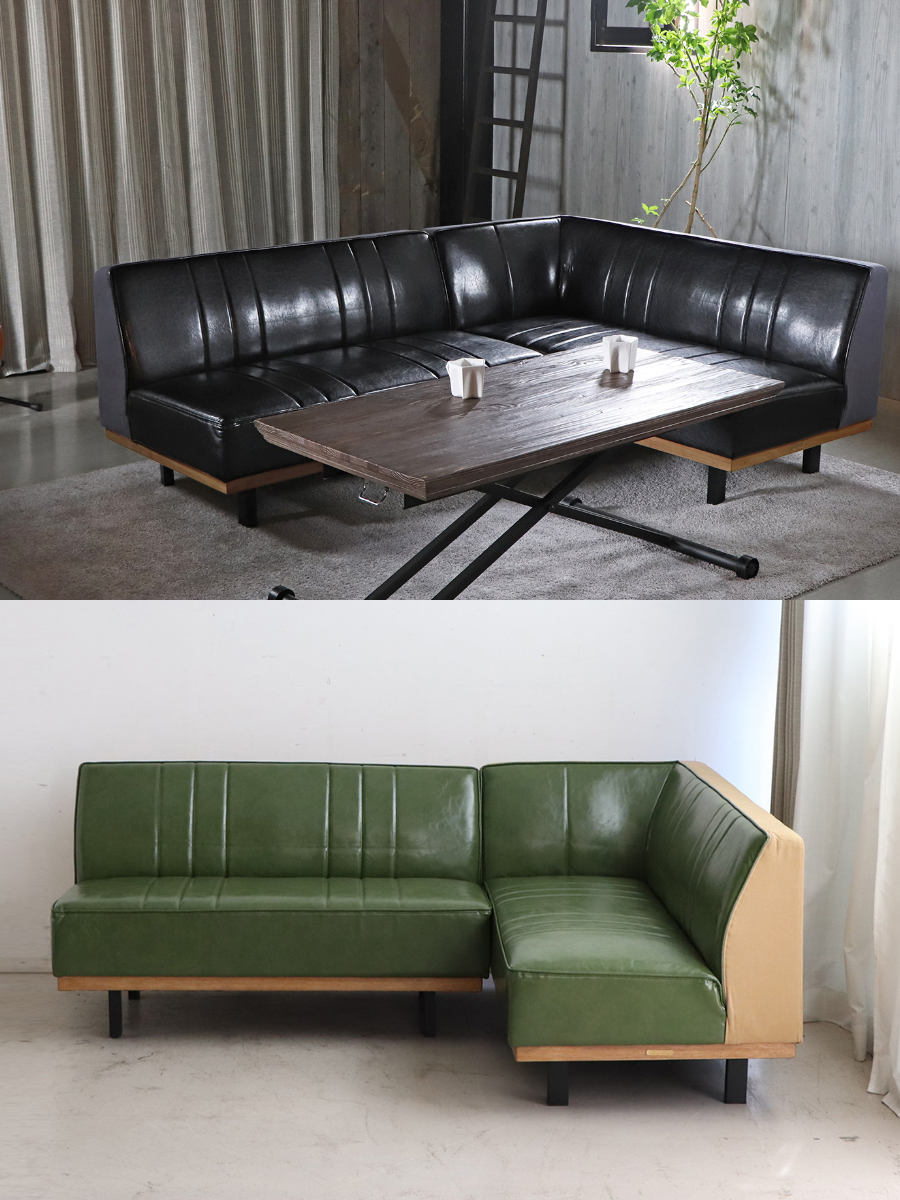 カウチソファとストレートソファ(ベンチ)の2点セット。L字に配置すればローテーブルを囲むくつろぎ空間に。コーナーに沿わせればリビングやワンルームでも省スペースで設置可能です。カラーはブラックとグリーンの2色展開です。