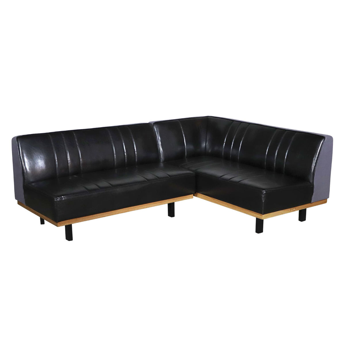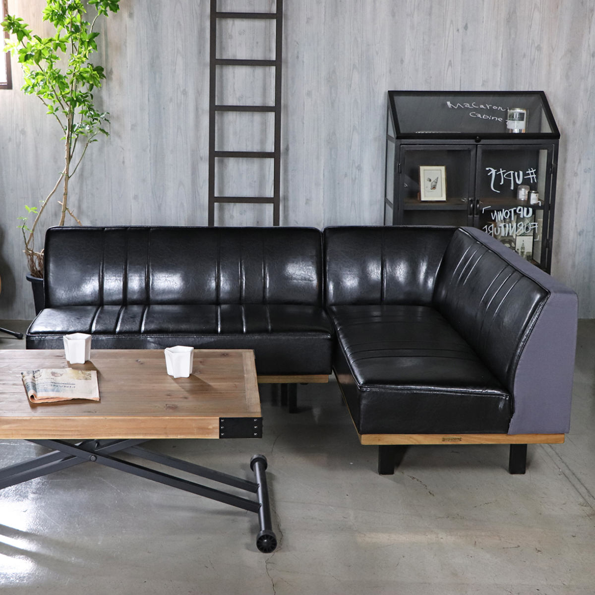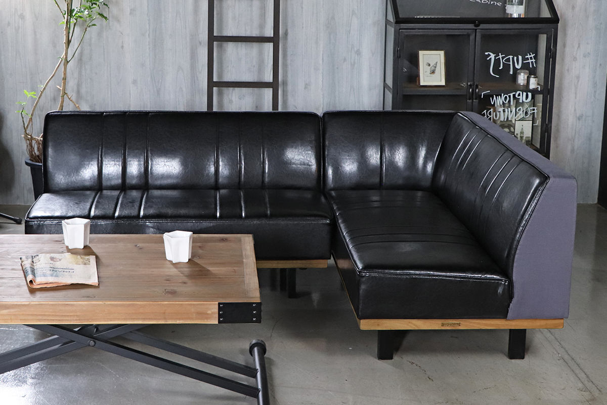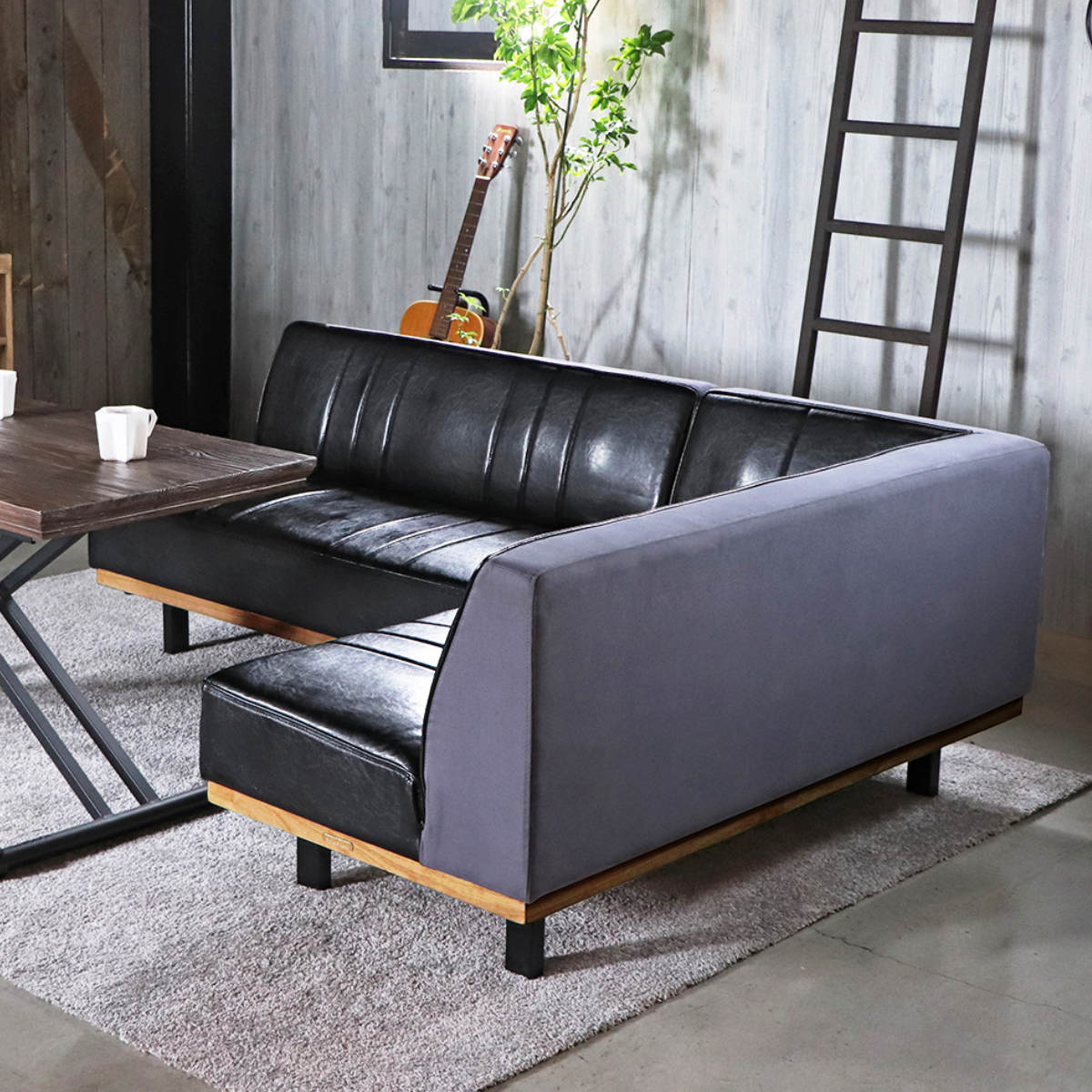 座面はレザー調ブラック、背面はグレーのファブリックを組み合わせた落ち着いたデザイン。モダンインテリアにも自然に馴染む、大人っぽい雰囲気のソファです。
