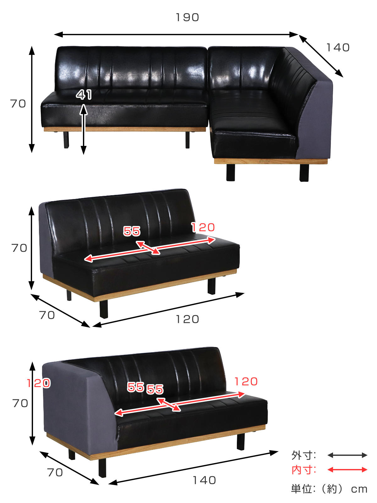 サイズストレートソファ:幅120×奥行70×高さ70×座面高さ(41cm)