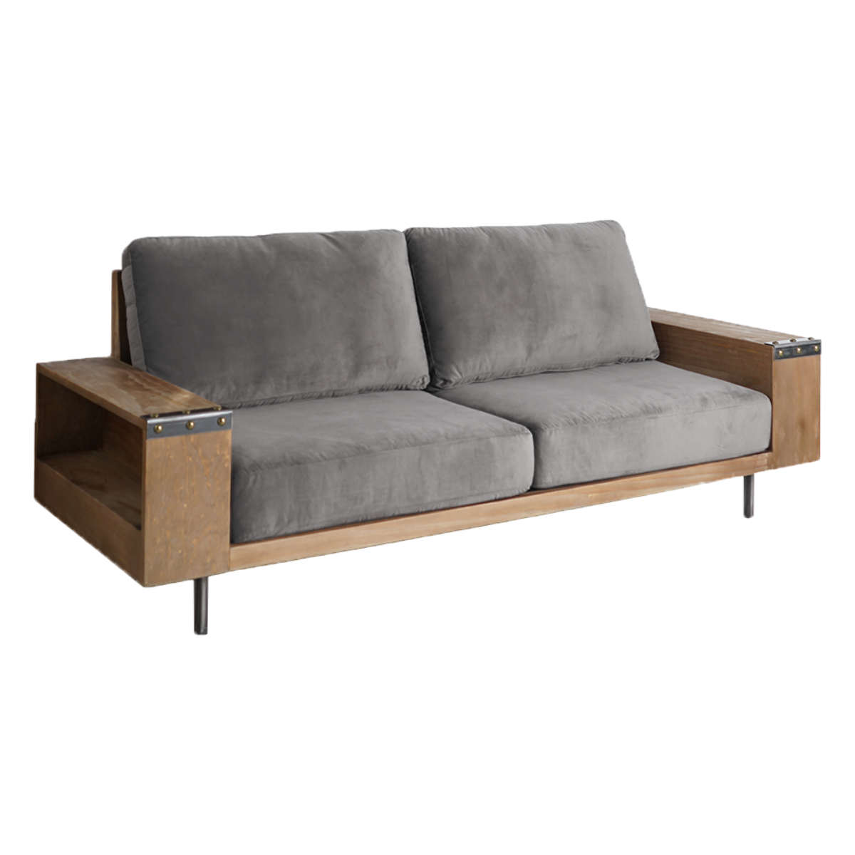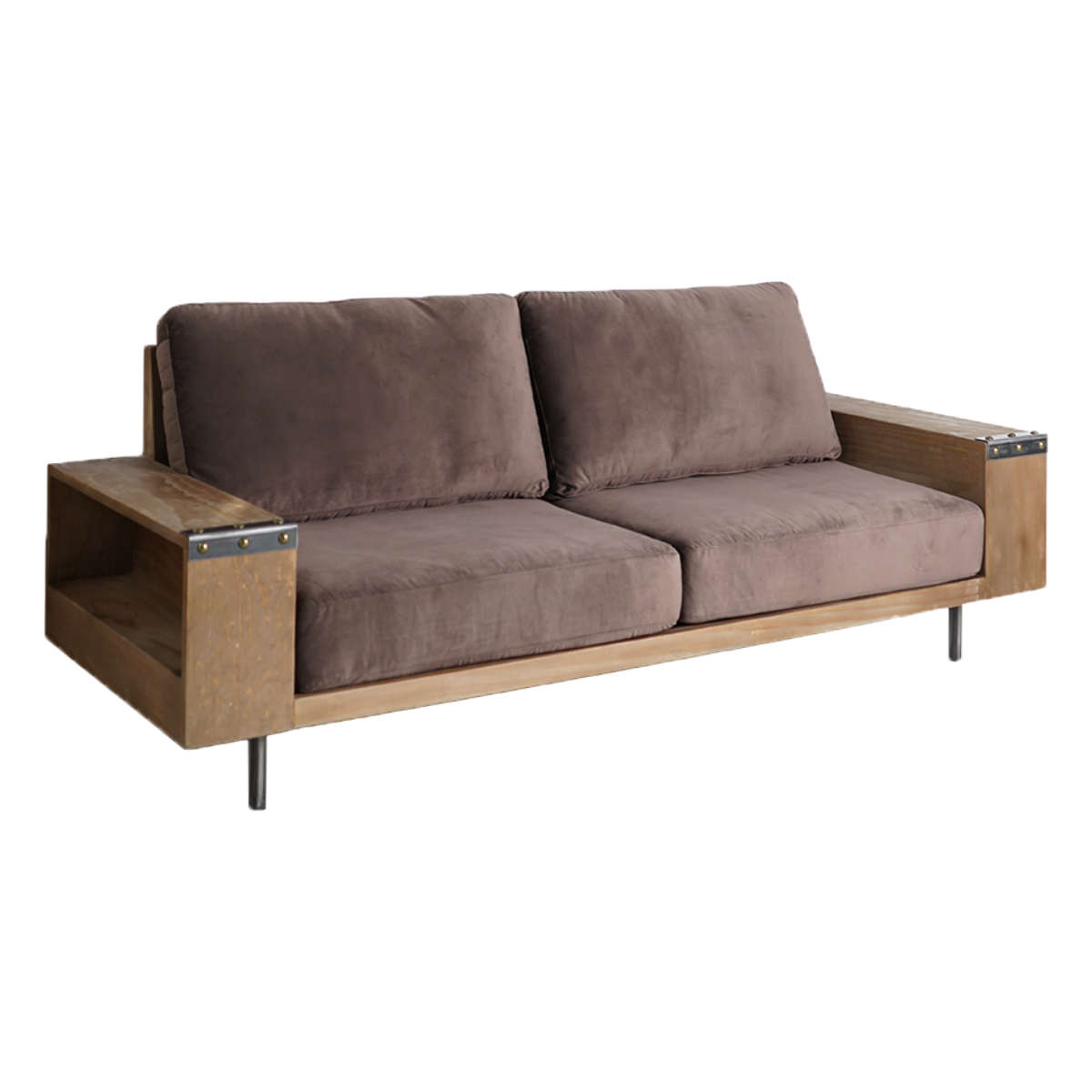 ソファ 幅198cm 2.5人掛け ジーク ラック付き ( リビングソファ 木製フレーム ソファー 完成品 木製 天然木 ヴィンテージ調 肘掛け サイド収納 棚付き ファブリック スチール脚 耐荷重100kg 丈夫 sofa ) 【ブラウン】