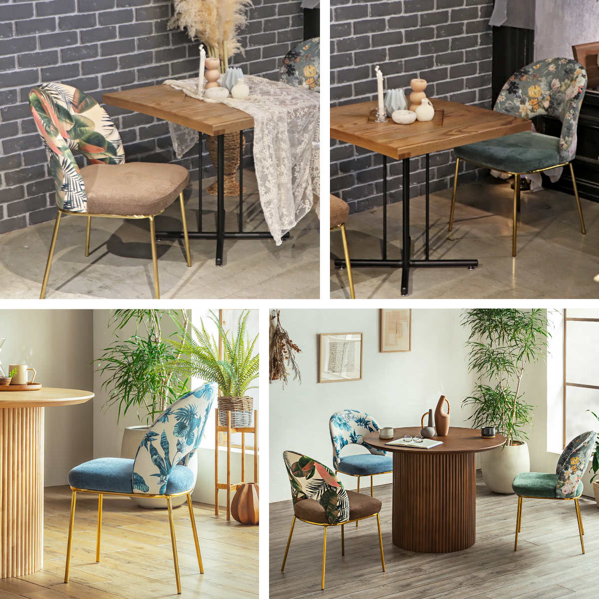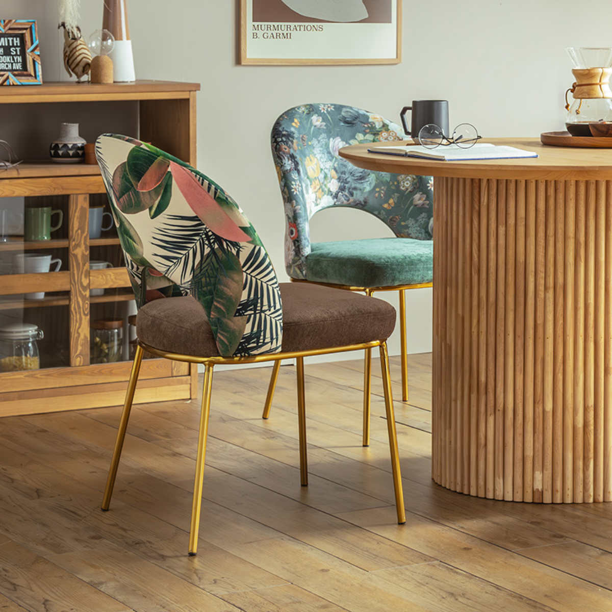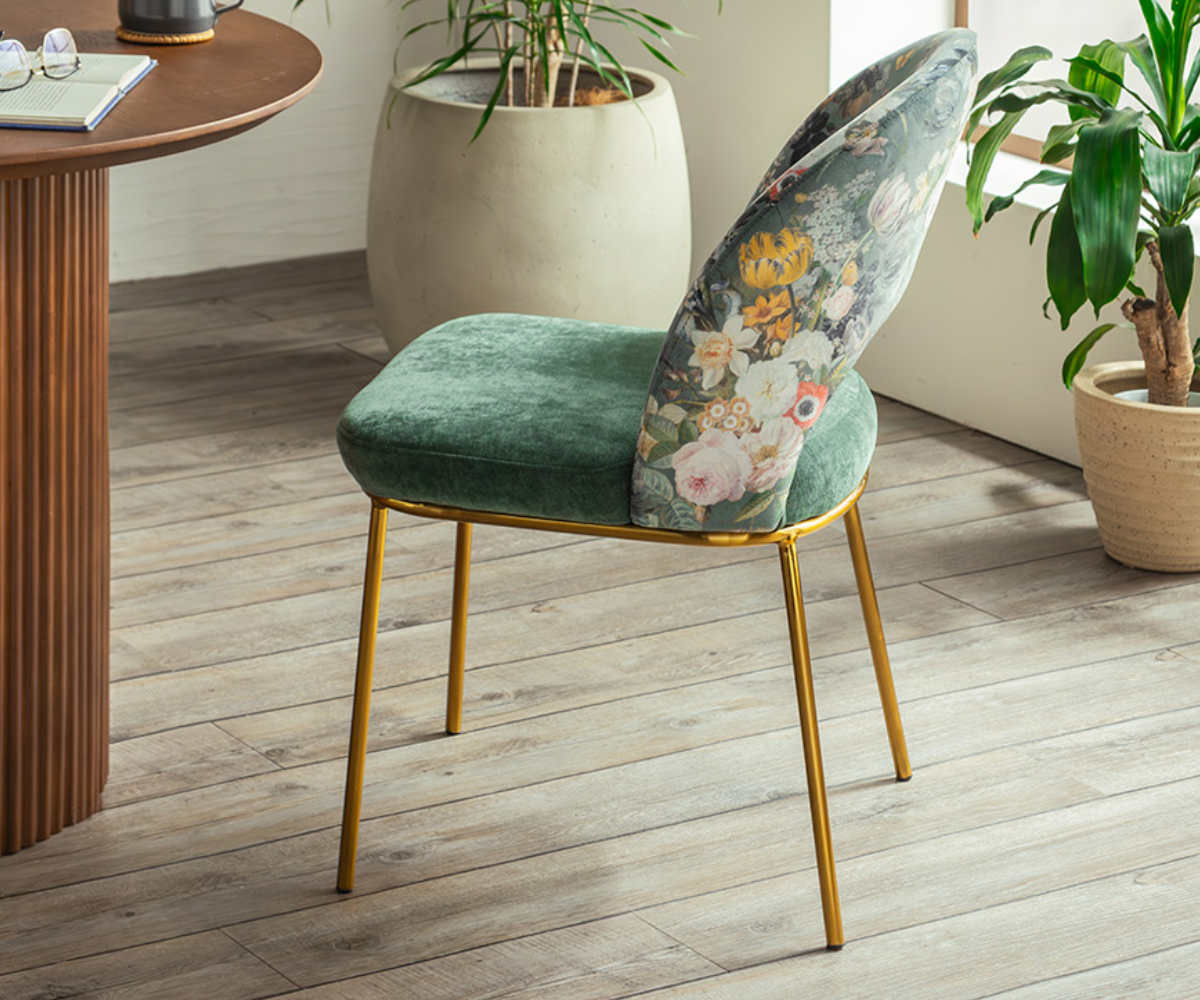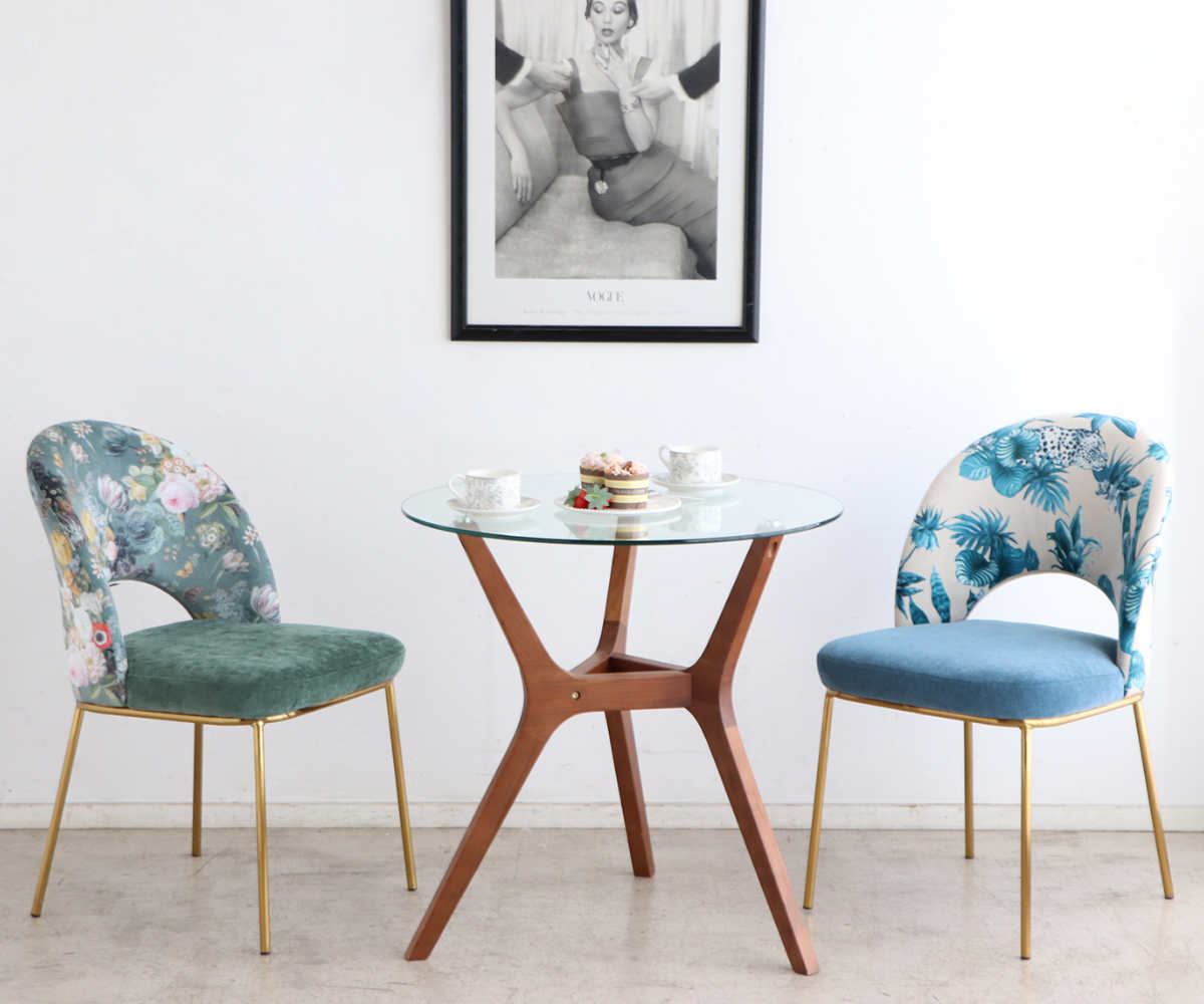 背もたれには、ボタニカル柄やフラワー柄などアーティスティックなデザインをご用意しました。無地の座面との組み合わせが柄を引き立て、空間に程よい華やかさをプラスします。