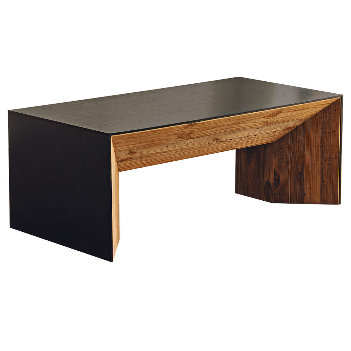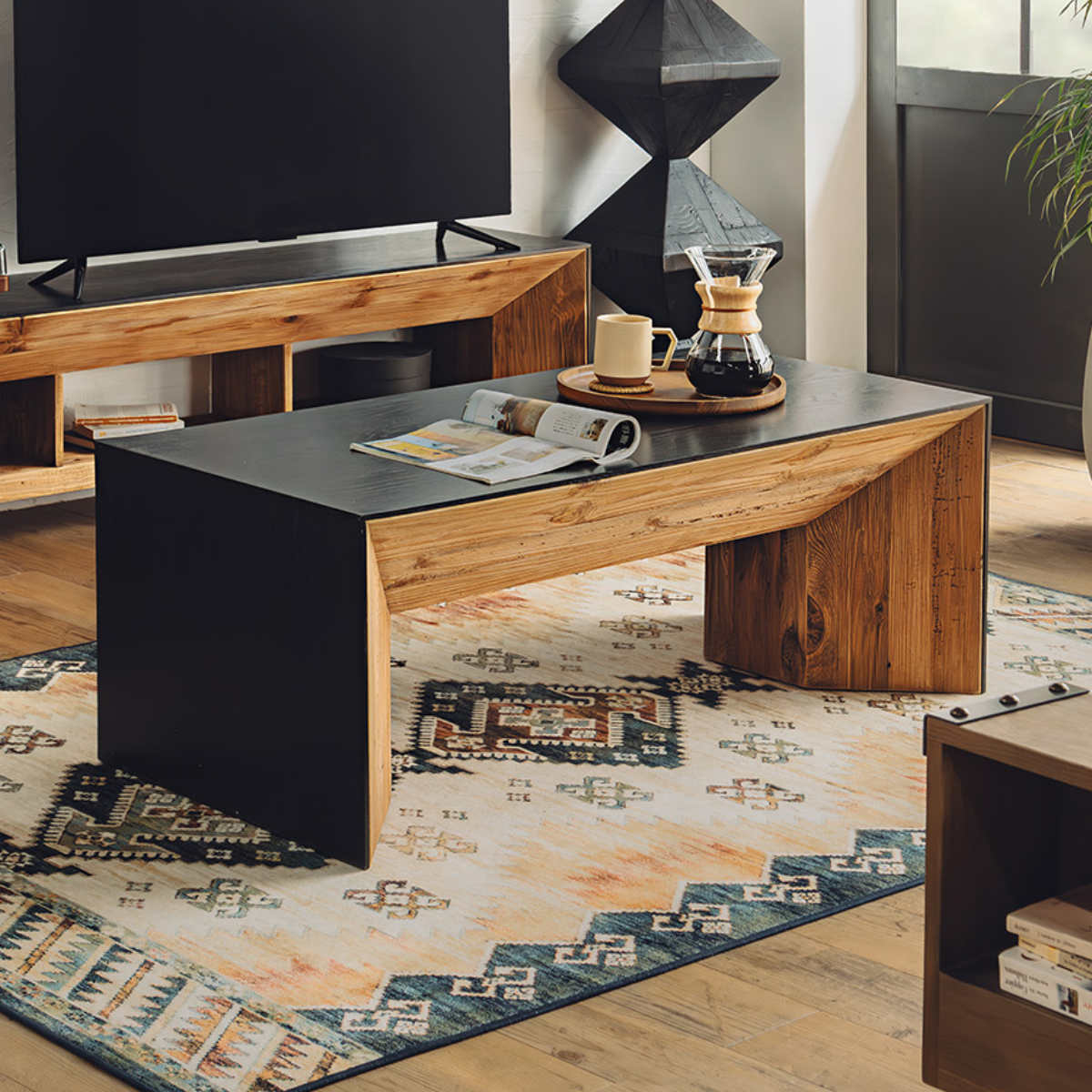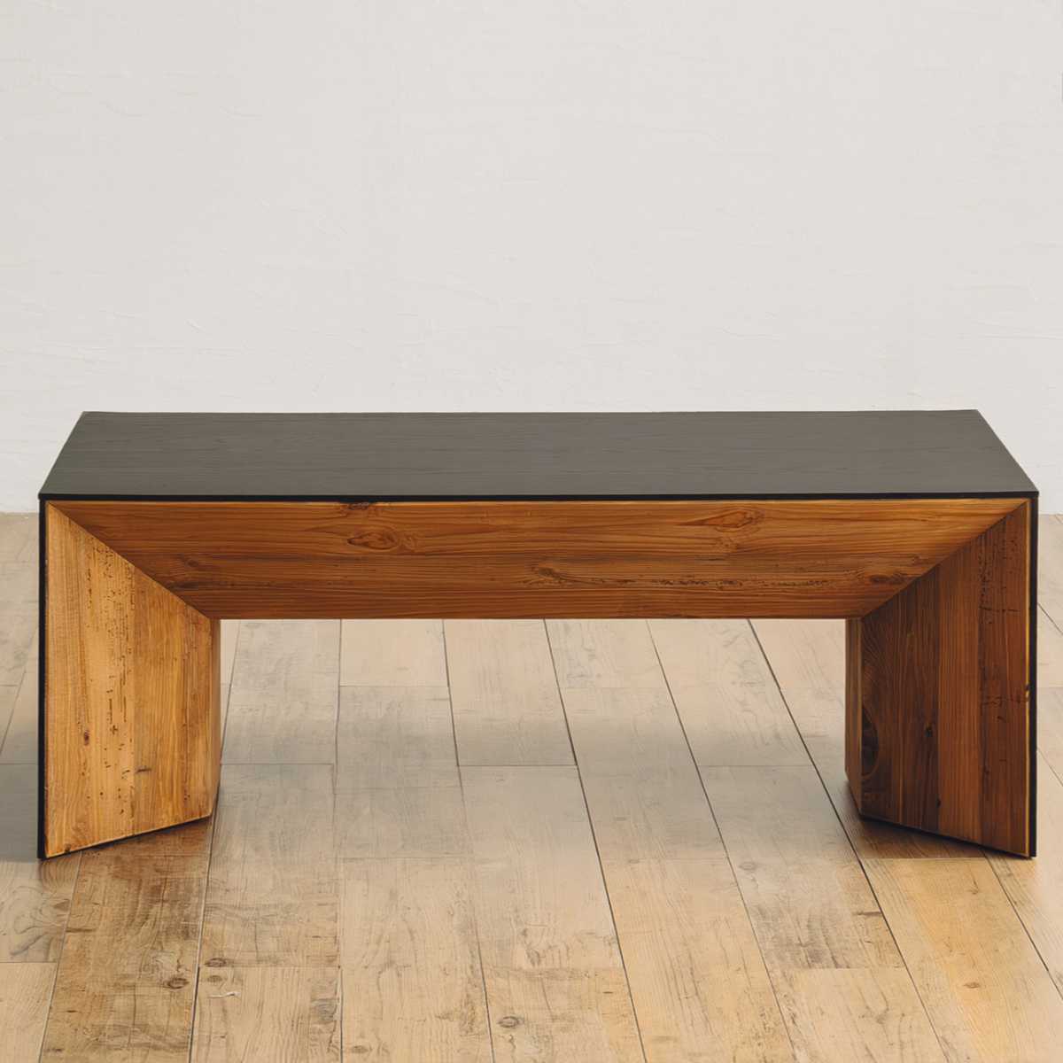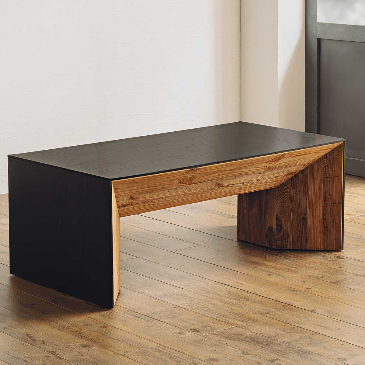 天板と側板は、空間を引き締めるブラックで統一。古材の持つ温もりと美しく調和し、洗練されたコントラストが空間にメリハリを与えます。