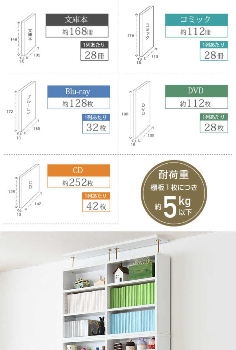 コミックやマンガ、DVDなどの収納できる枚数です。コンパクトなのにこの収納力は魅力的なポイントです。
