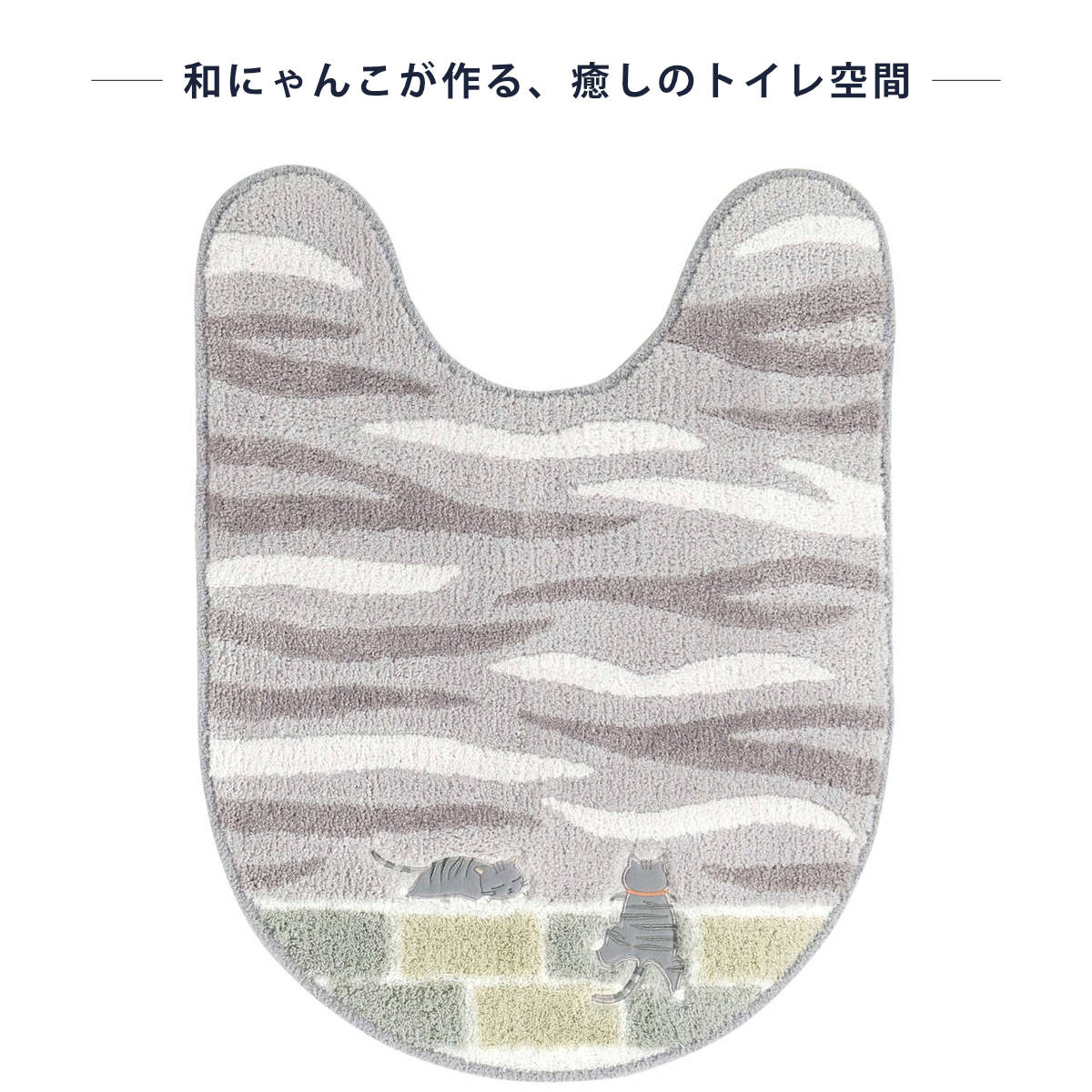 天真爛漫な可愛らしい和にゃんこに癒されるトイレマットです。マイペースに過ごすサバトラたちをアップリケ刺繍で表現した遊び心のある楽しいデザインです。