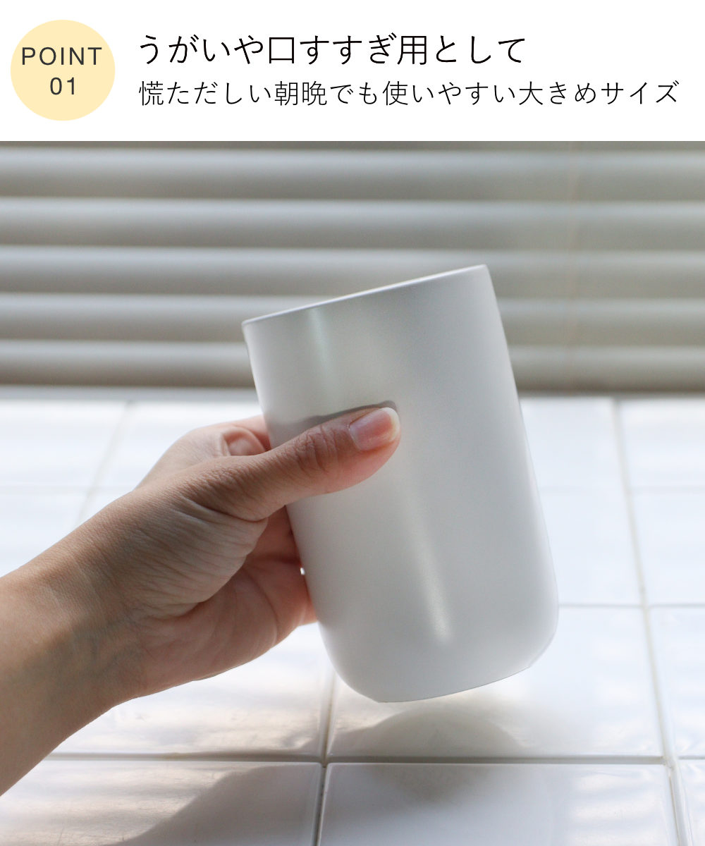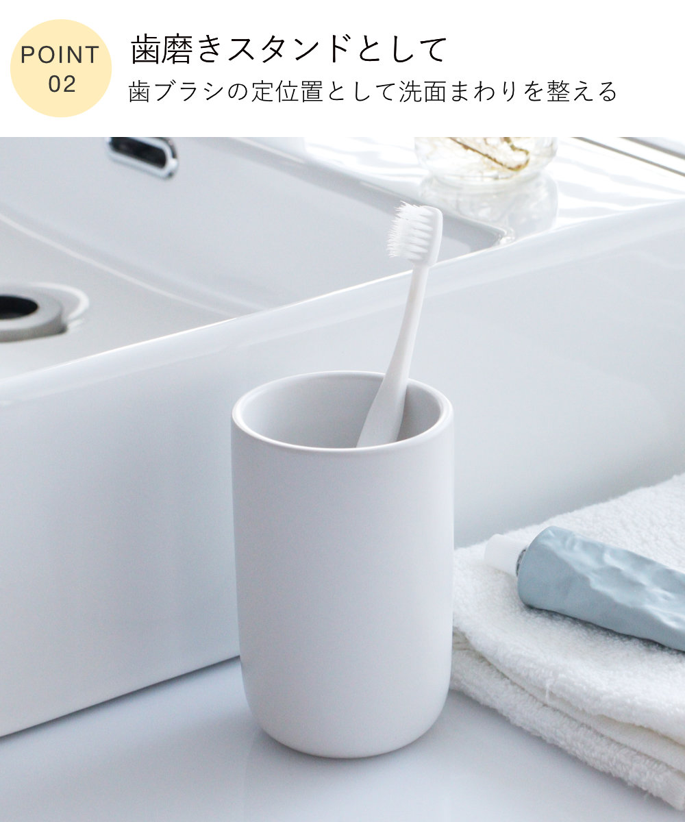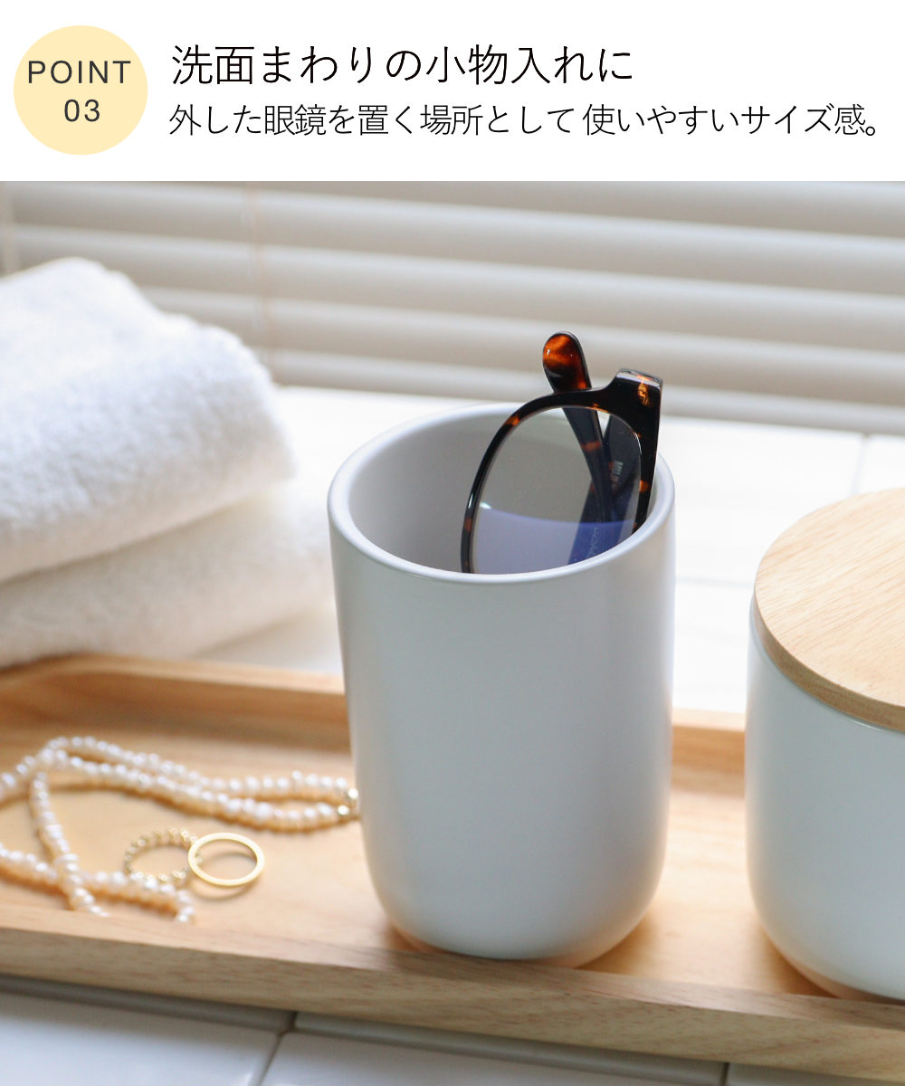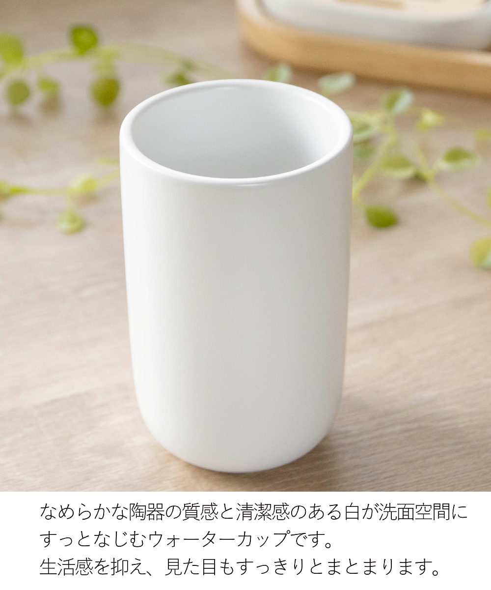 毎日の身支度に使いやすく、清潔感のある陶器が心地よくなじみます。うがいや口すすぎに使いやすい、ゆとりのあるサイズ感です。