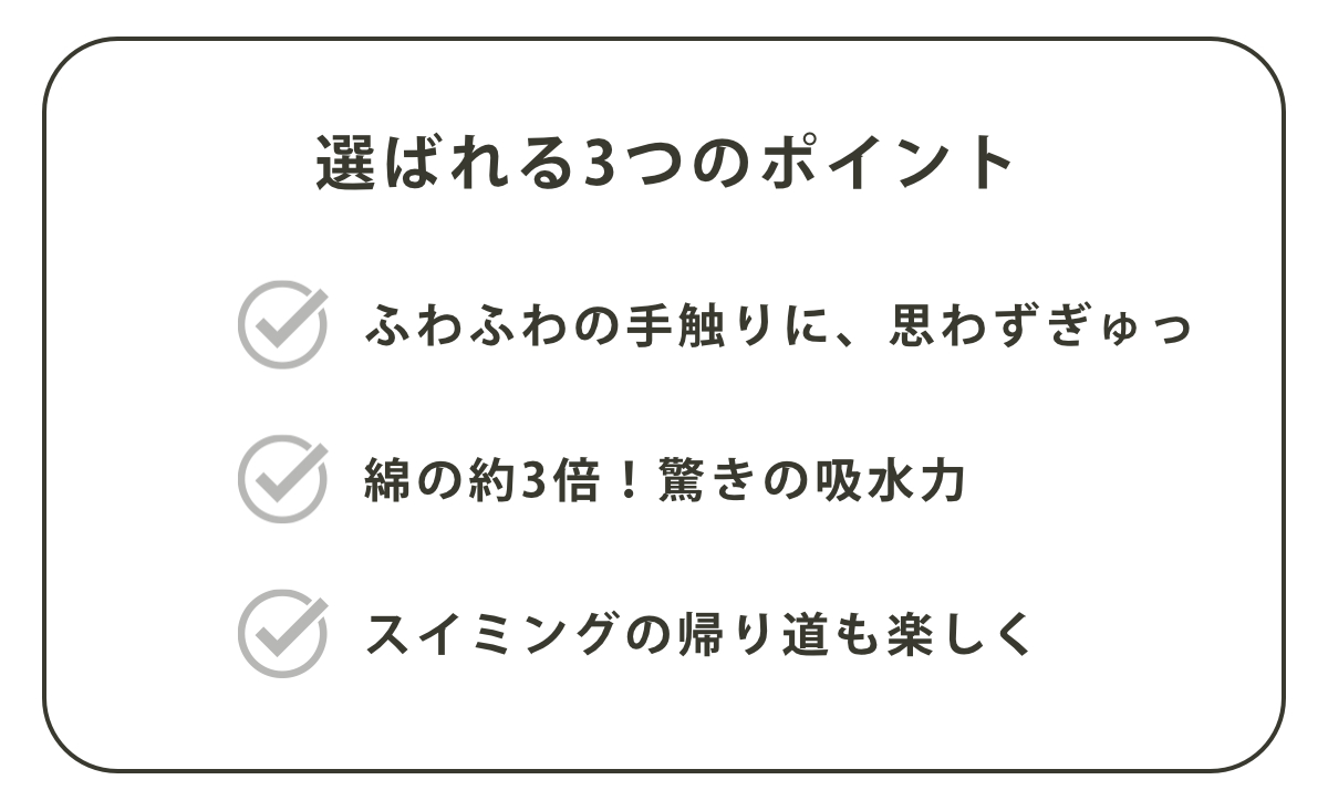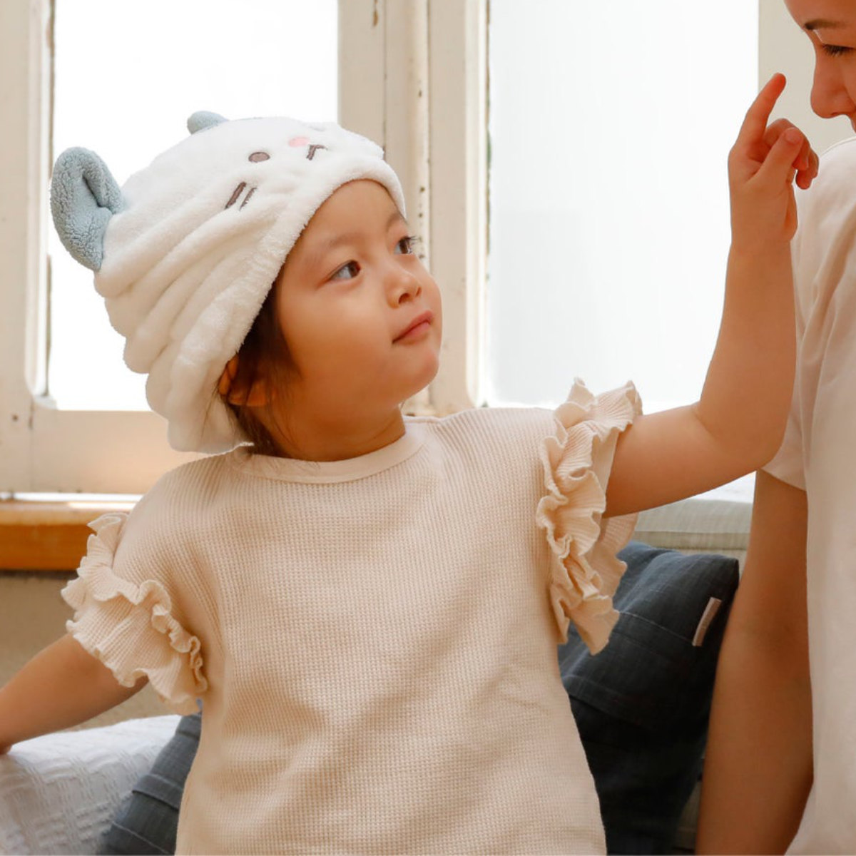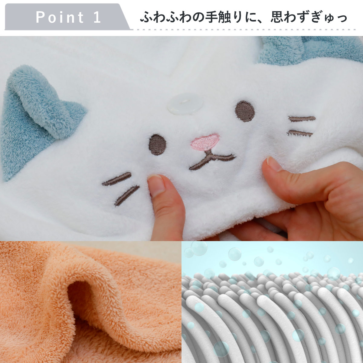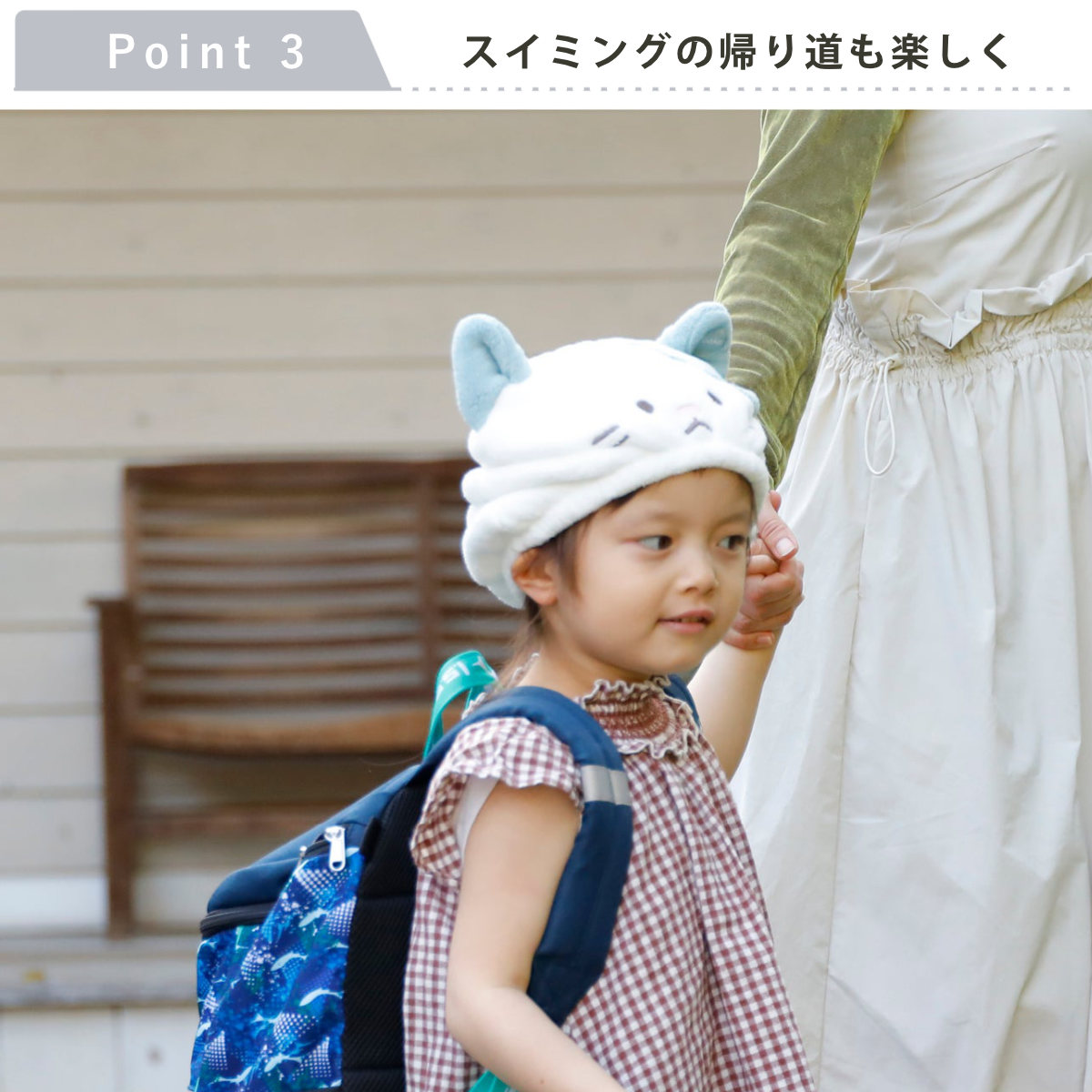 綿の約3倍の吸水力を持つマイクロファイバー生地を使用しています。お風呂上がりに被るだけで、タオルドライが簡単に完了。じっとしていられないお子様にピッタリです。