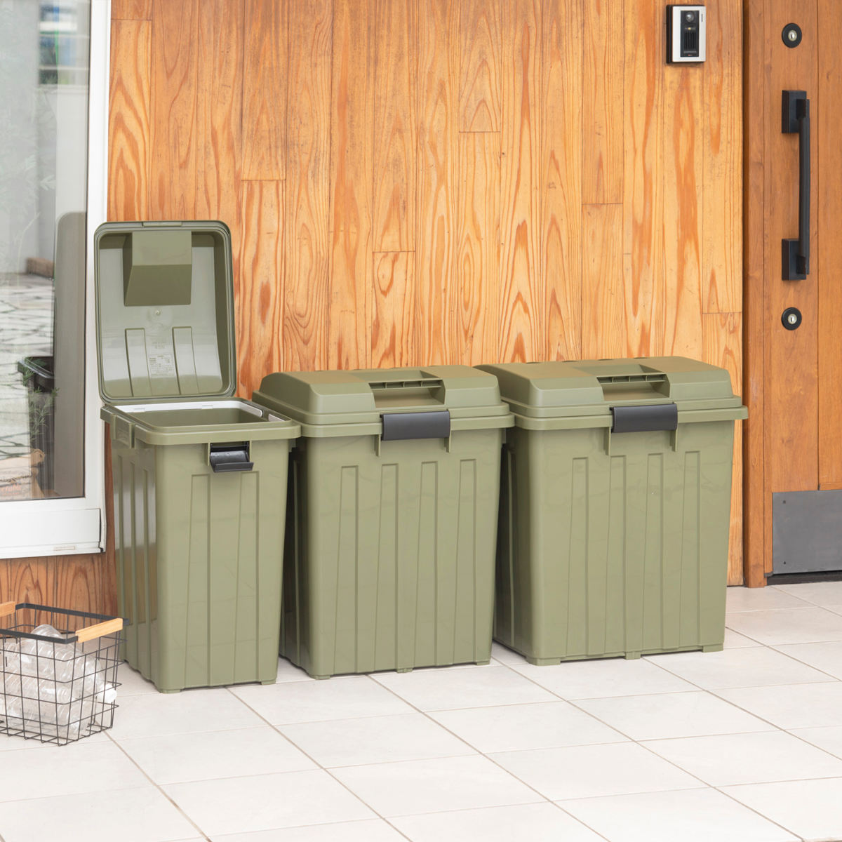 凹凸のある頑丈なボディと、雨水がたまりにくい形状のふたにより、屋外でも安心して使用できます。ふたは取り外せるので、お手入れも簡単です。
