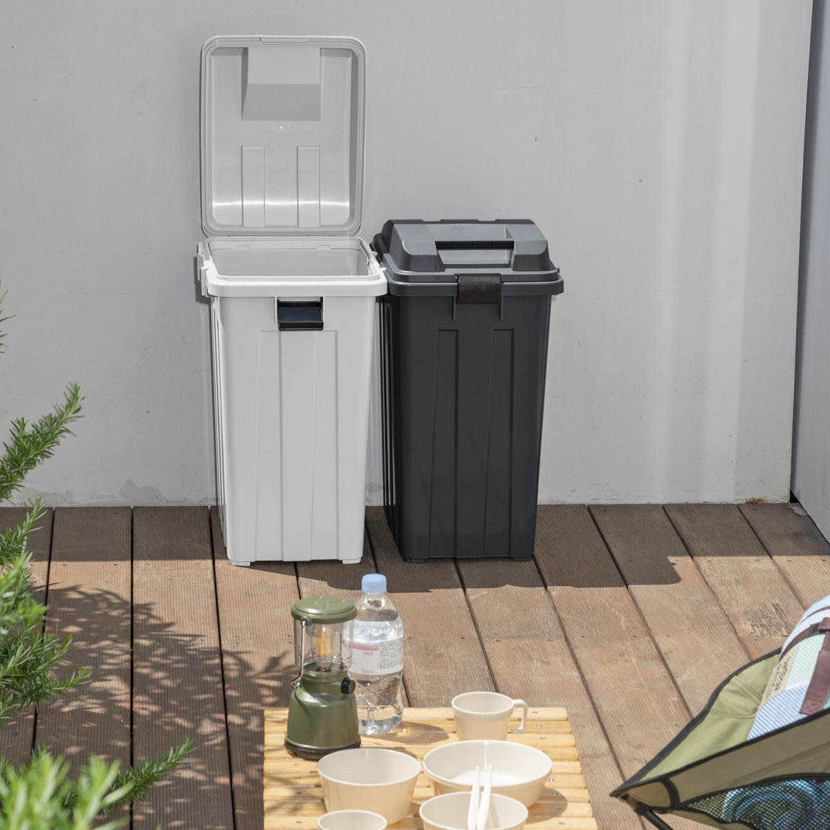 凹凸のある頑丈なボディと、雨水がたまりにくい形状のふたにより、屋外でも安心して使用できます。ふたは取り外せるので、お手入れも簡単です。
