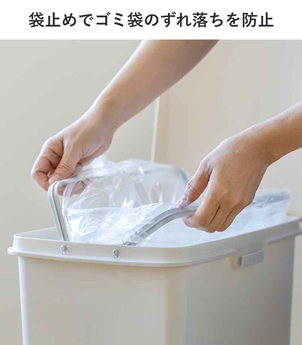 引っ掛けるだけでゴミ袋をセットできます。ゴミ袋のズレ落ちを防止し、袋がはみ出さないので生活感をオフ。お部屋の雰囲気を壊しません。