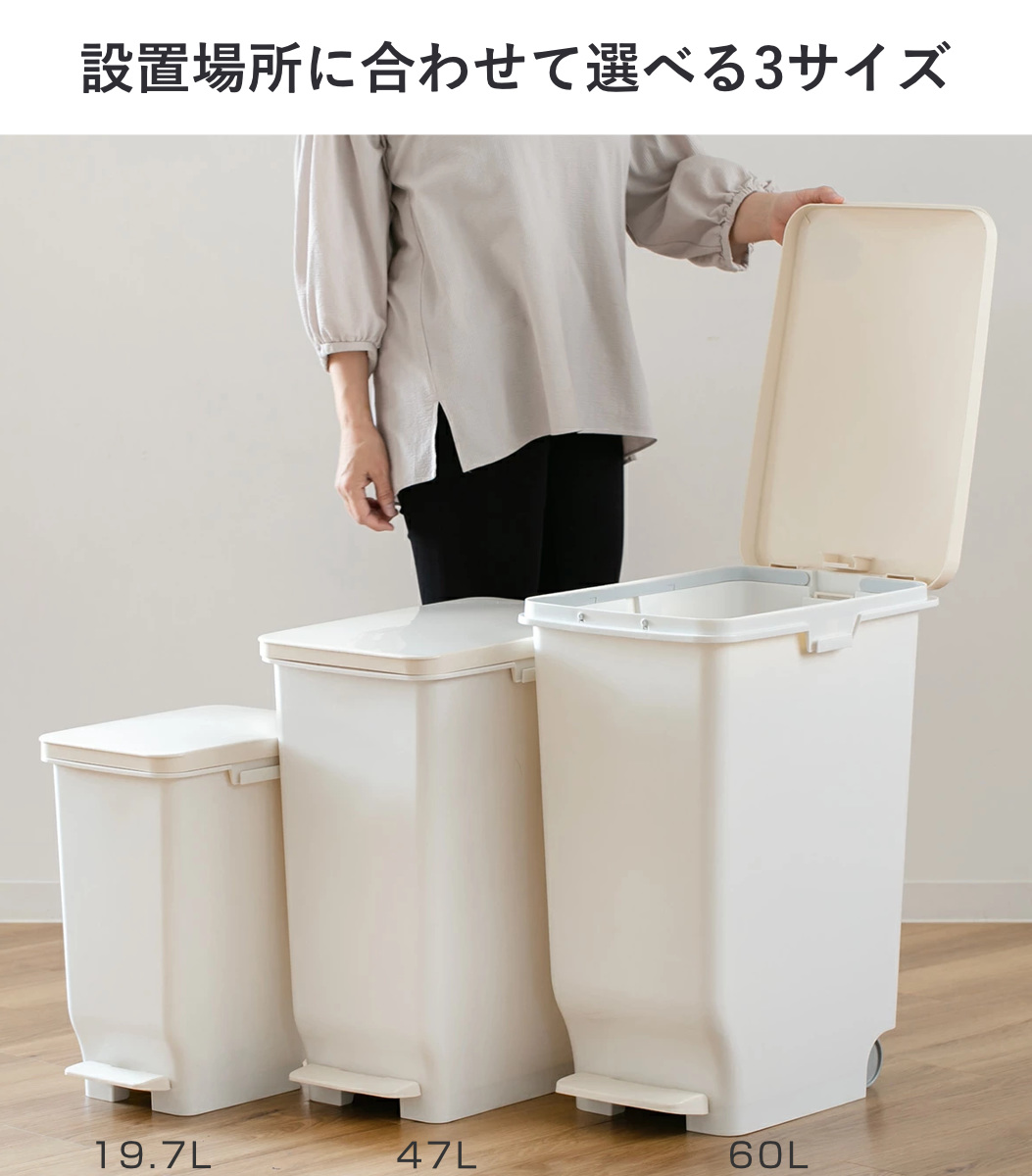セパスリムシリーズは、19.7L/47L/60Lの3サイズ展開で、置きたい場所に合わせて容量を選べます。シリーズで揃えることでお部屋に統一感が生まれます。