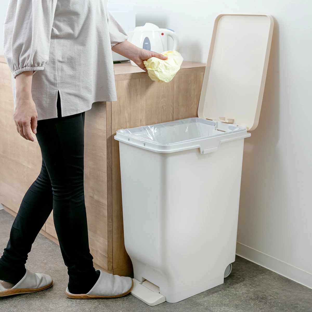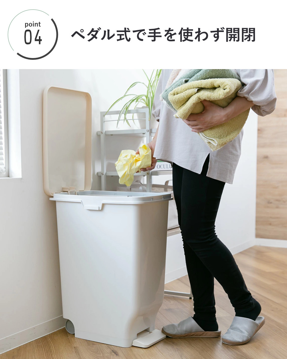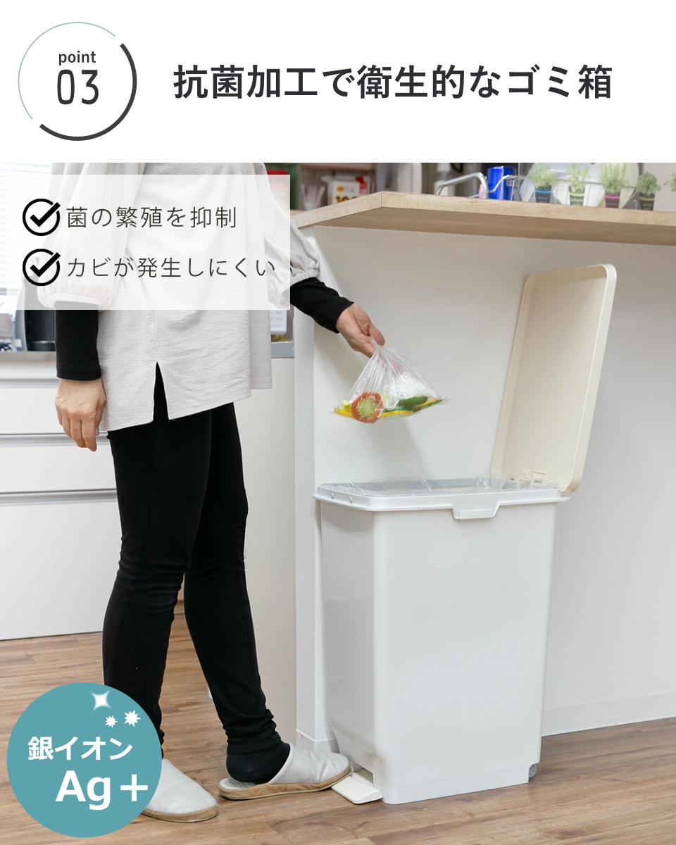 両手がふさがっていても開けられるため、調理中など手が離せない場面でも便利。資源ゴミも洗いながらスムーズに捨てられます。抗菌加工でカビが発生しにくいので衛生面も安心です。