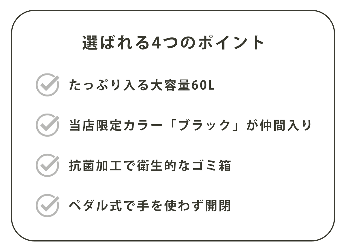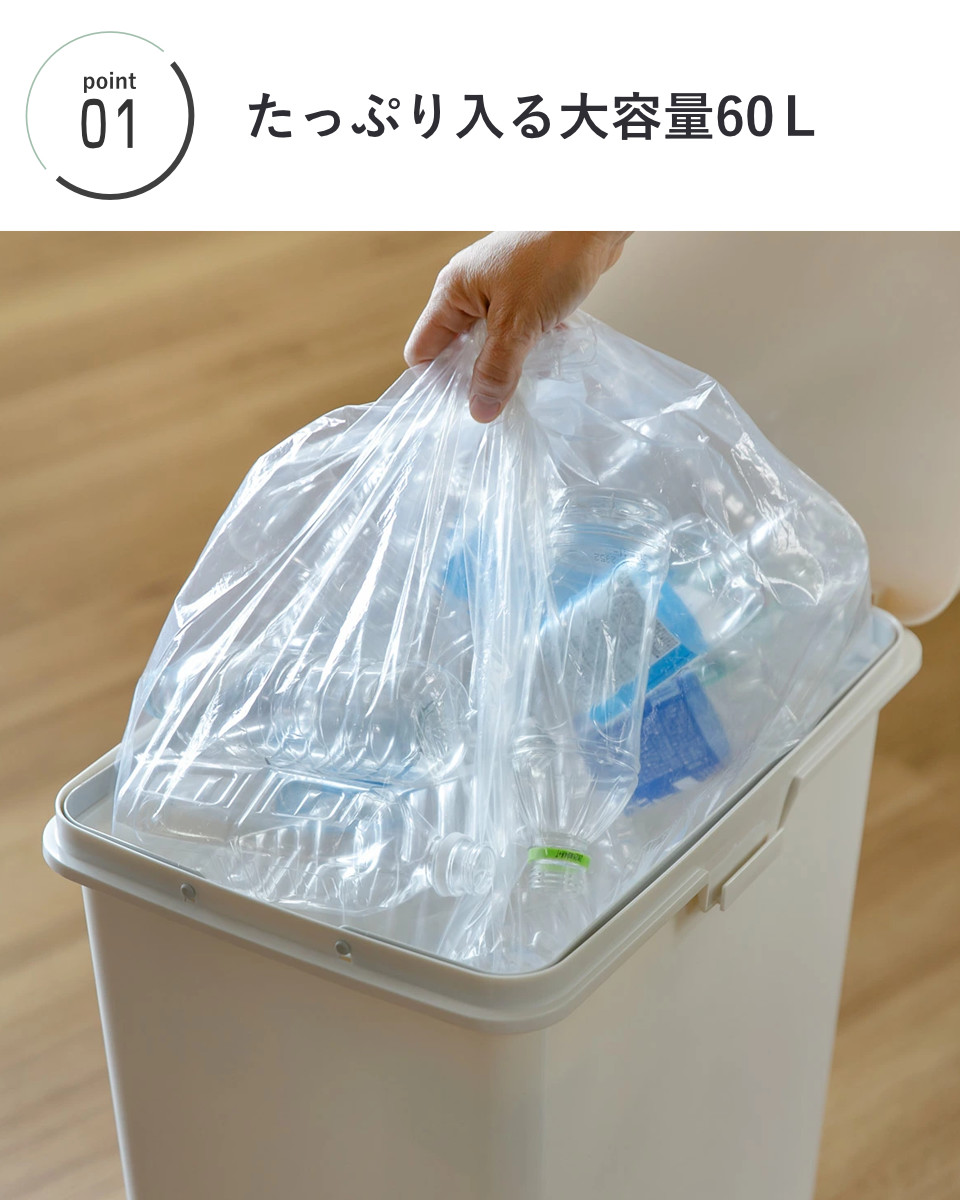 60Lの大容量設計だから、袋交換の回数も減って家事の手間を軽減。キッチンやリビングに置いても圧迫感の出にくい、実用性とサイズ感のバランスにこだわりました。ご家族の多いご家庭やオフィスなどにもおすすめです。