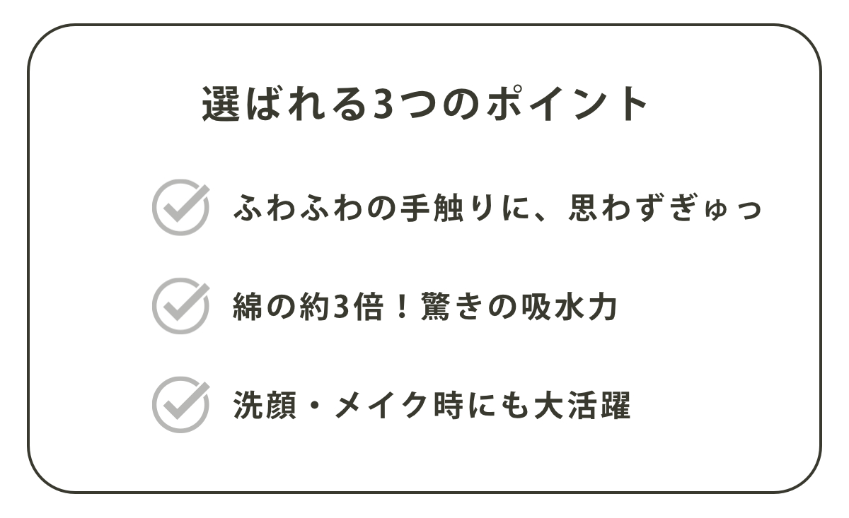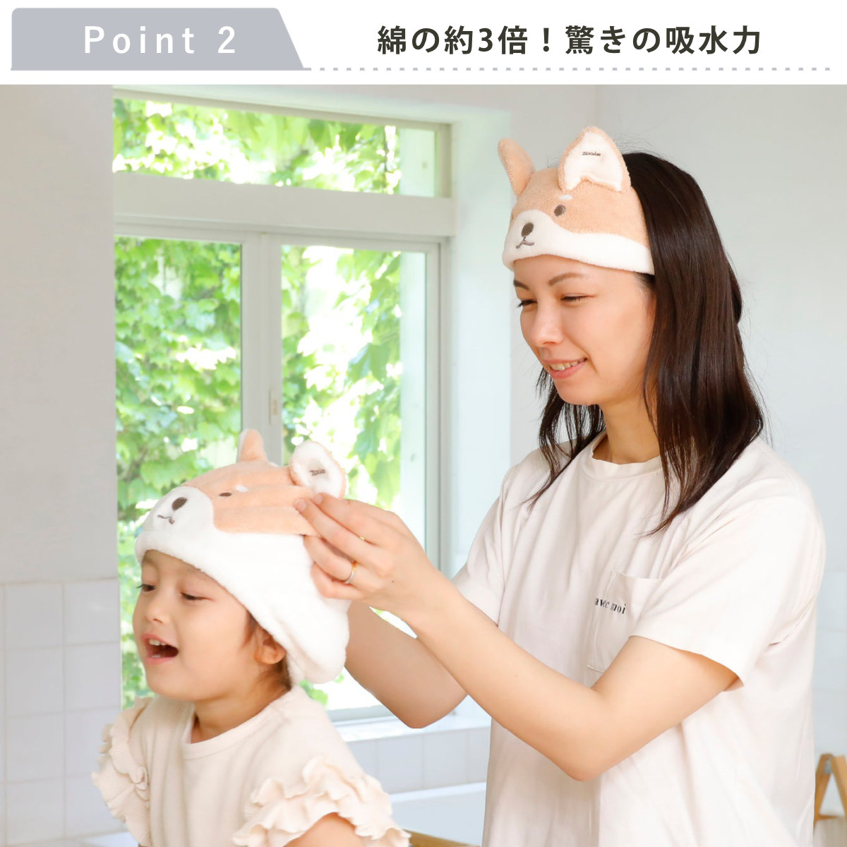 綿の約3倍の吸水力を持つマイクロファイバー生地を使用しています。お風呂上がりに被るだけで、タオルドライが簡単に完了。髪を乾かす余裕がない方や、じっとしていられないお子様にピッタリです。
