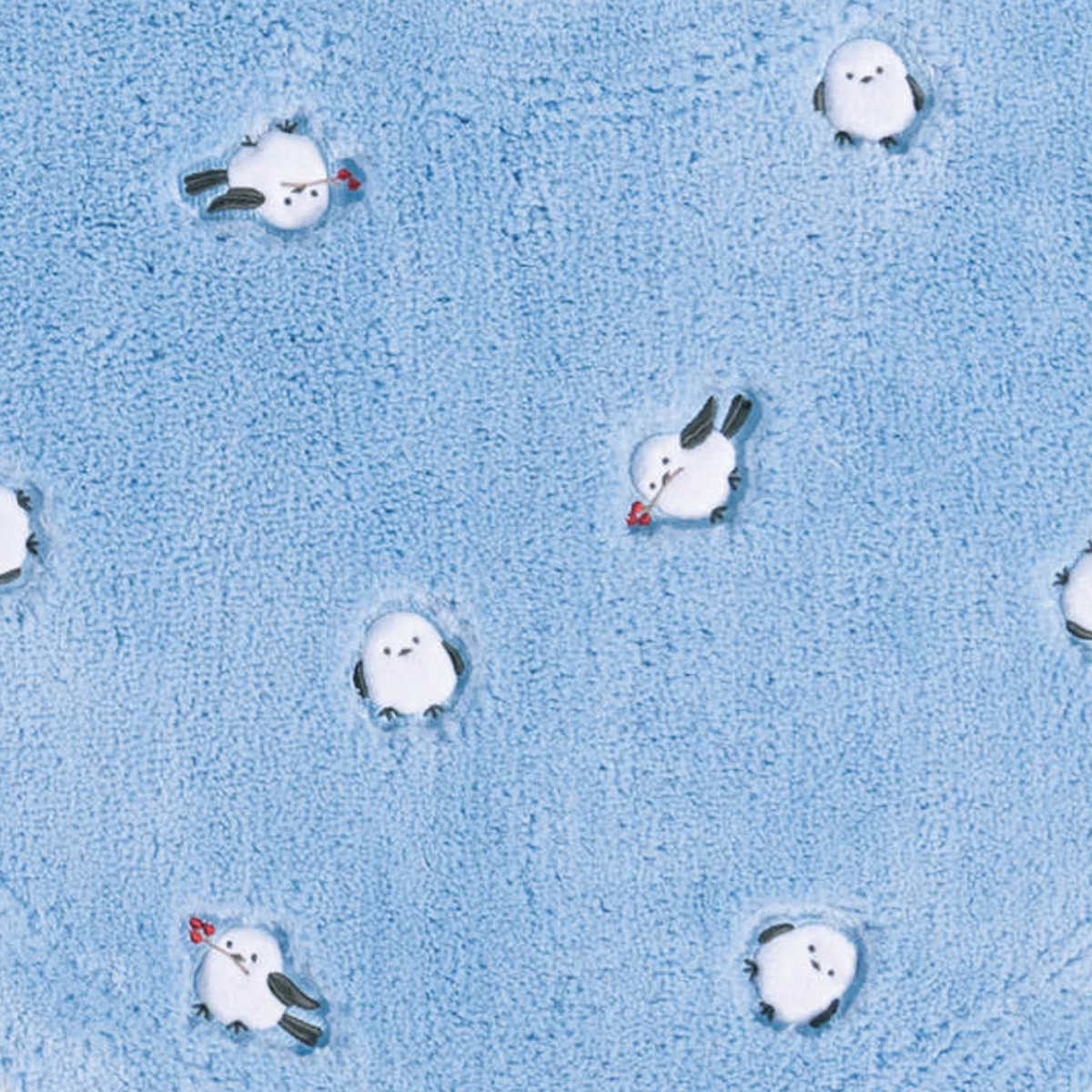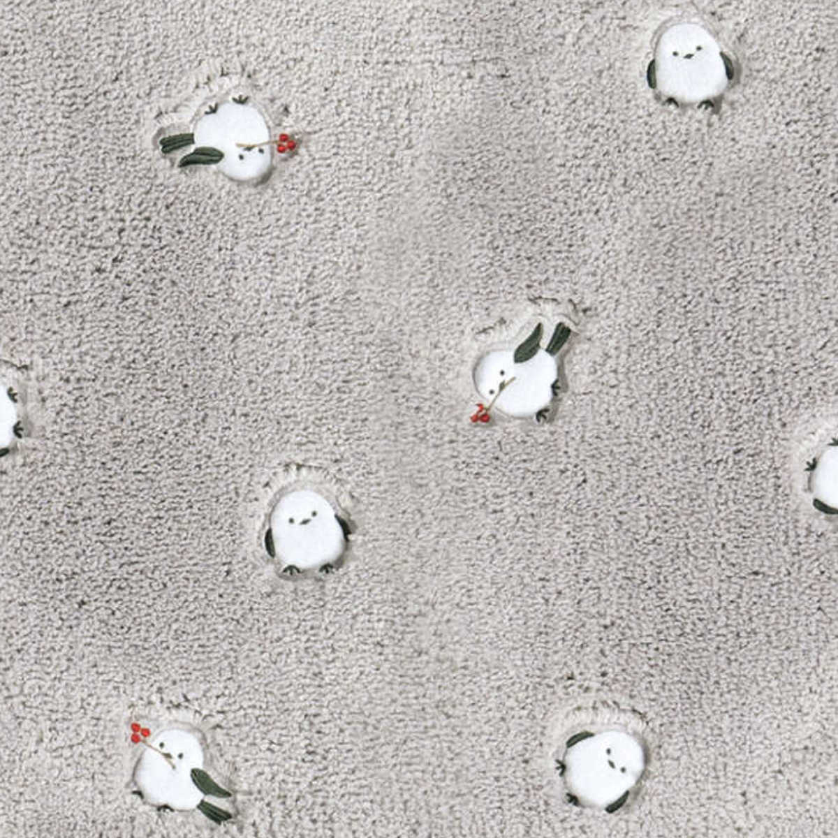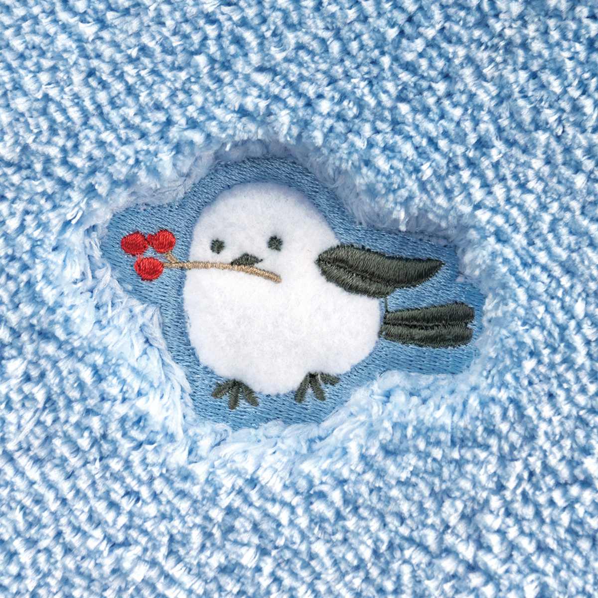 シマエナガの三姉弟を、アップリケ刺繍で愛らしく表現しました。ポリエステル糸ならではの細い糸を使用しており、ふわふわとした心地よい手触りを楽しめます。
