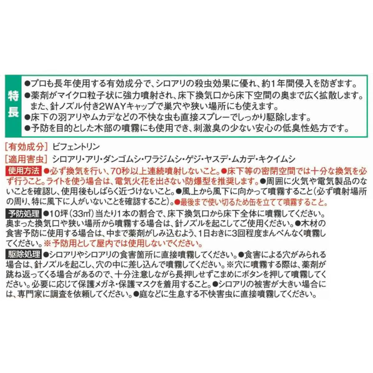 ・有効成分はプロも長年使用する残効性の高い薬剤で、シロアリの駆除効果・侵入予防効果が約1年持続します。
