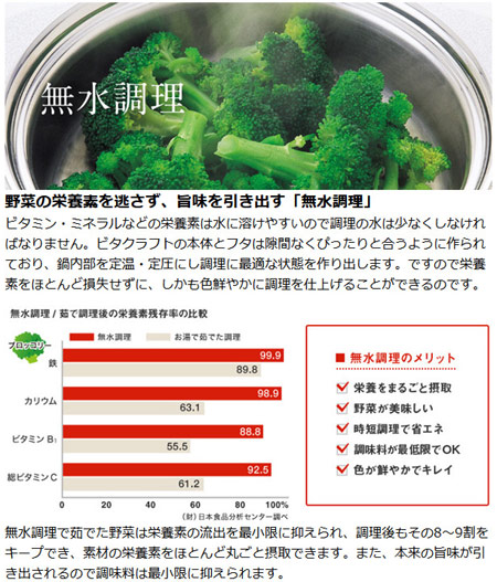 ![]() 野菜の栄養素を逃さず、旨味を引き出す「無水調理」 ビタミン・ミネラルなどの栄養素は水に溶けやすいので調理の水は少なくしなければなりません。ビタクラフトの本体とフタは隙間なくぴったりと合うように作られており、鍋内部を定温・定圧にし調理に最適な状態を作り出します。ですので栄養素をほとんど損失せずに、しかも色鮮やかに調理を仕上げることができるのです。 ![]() 無水調理で茹でた野菜は栄養素の流出を最小限に抑えられ、調理後もその8~9割をキープでき、素材の栄養素をほとんど丸ごと摂取できます。また、本来の旨味が引き出されるので調味料は最小限に抑えられます。 | ||