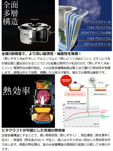 | ビタクラフトが可能にした究極の熱効率 全面多層構造にすることで、高い熱吸収性(熱しやすく)、熱伝導性(熱を素早く伝え)、保温性(熱を逃さない)が生じ、他にはマネできない突出した熱効率を作り出します。側面の熱伝導は、底のみ多層構造の高級貼り底鍋と比較しても明らかです。 | ||