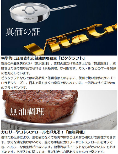 ![]() アメリカの建国精神「家庭の健康は家庭料理で守っていく」の考えにもとづき、1939年の創業以来、一貫して健康調理を提唱するビタクラフト。その製品は世界最高級の調理器具として、世界中の家庭で愛用され続けています。 | ||