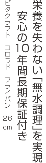 ![]() 自信があるからできる「10年間の長期保証」 品質と実績への確かな自信のあらわれが、ビタクラフト10年間長期保証です。 創業時と変わらない姿勢で世界中の家庭への最高級の調理器具をお届けします。 正常な使用で故障が生じた場合、一切無料で修理もしくはお取り替えいたします。 ご注意点 修理の際など購入店、購入日を明記したものが必要となります。 必ず保証書と共に、商品に同梱してお送りする当社の納品書を一緒に保管下さい。 | ||