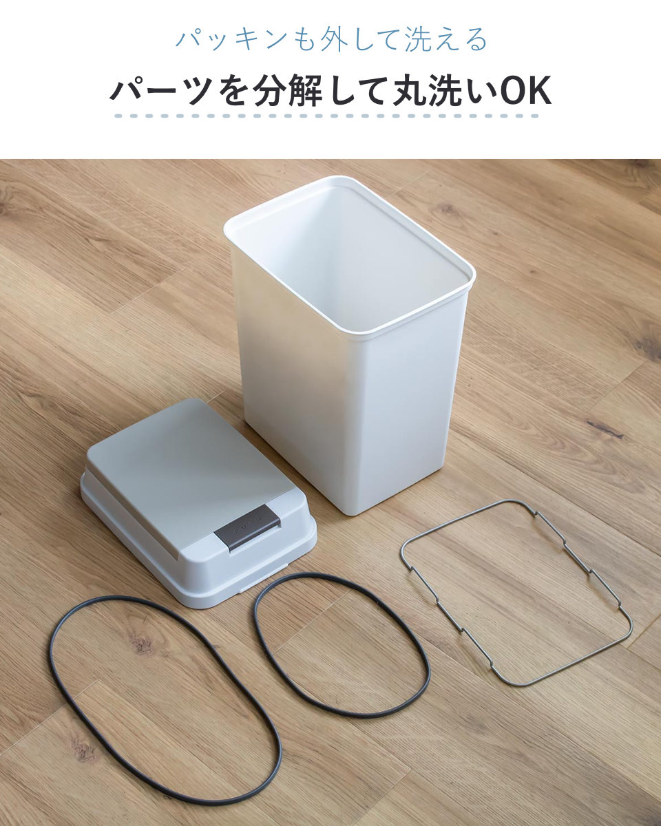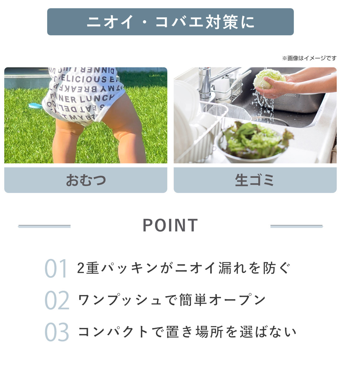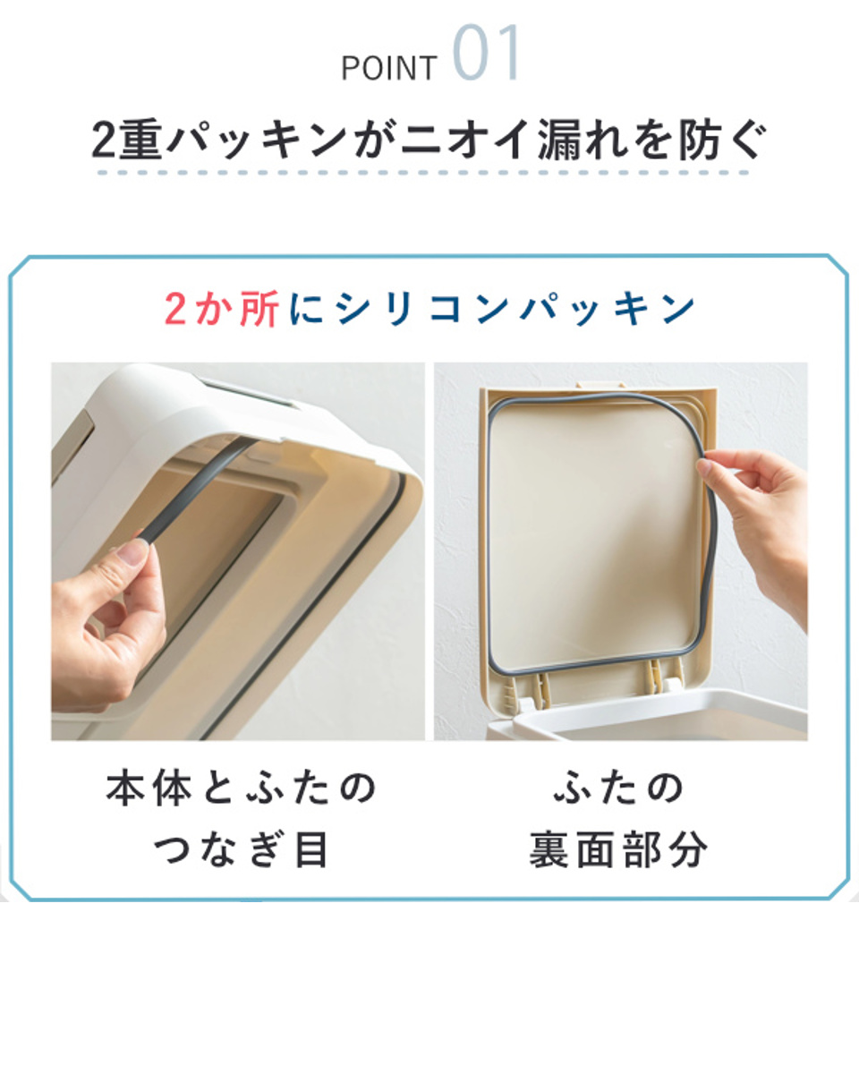 密閉性の高いダブルパッキン構造。生ゴミだけでなく、おむつ用やペット用など、ニオイの気になるゴミを捨てるのに最適です。キッチンやリビングに快適な空間を保ちます。