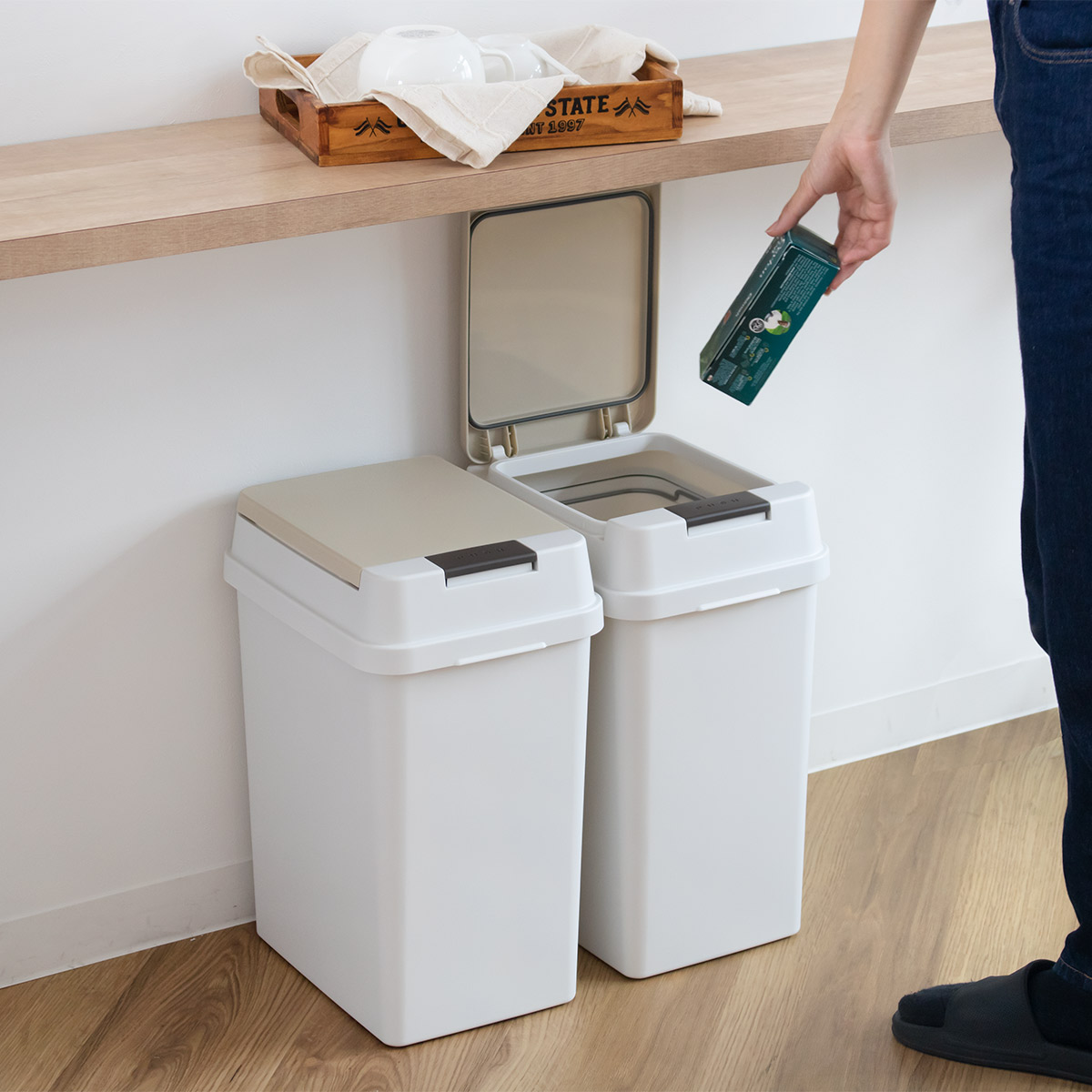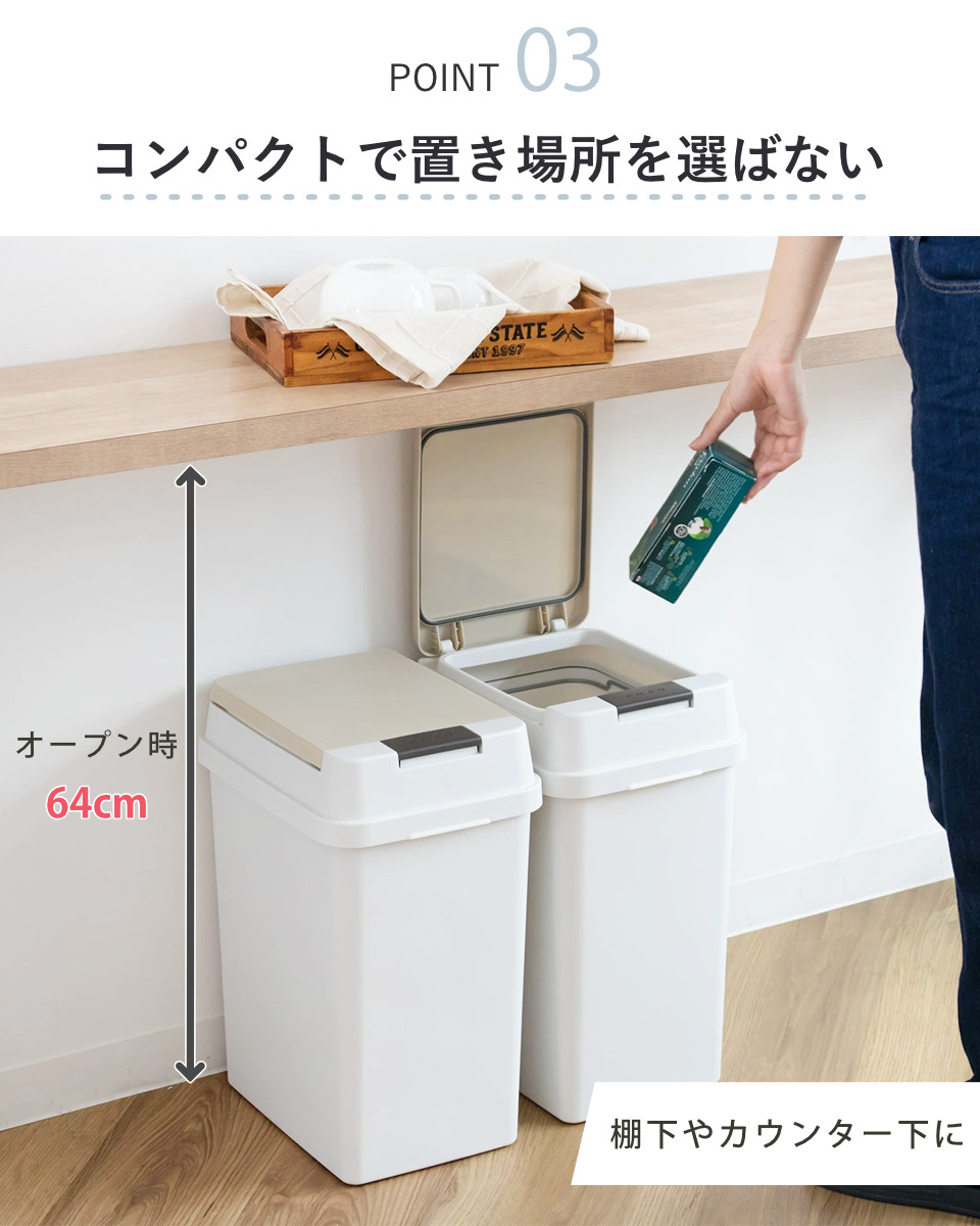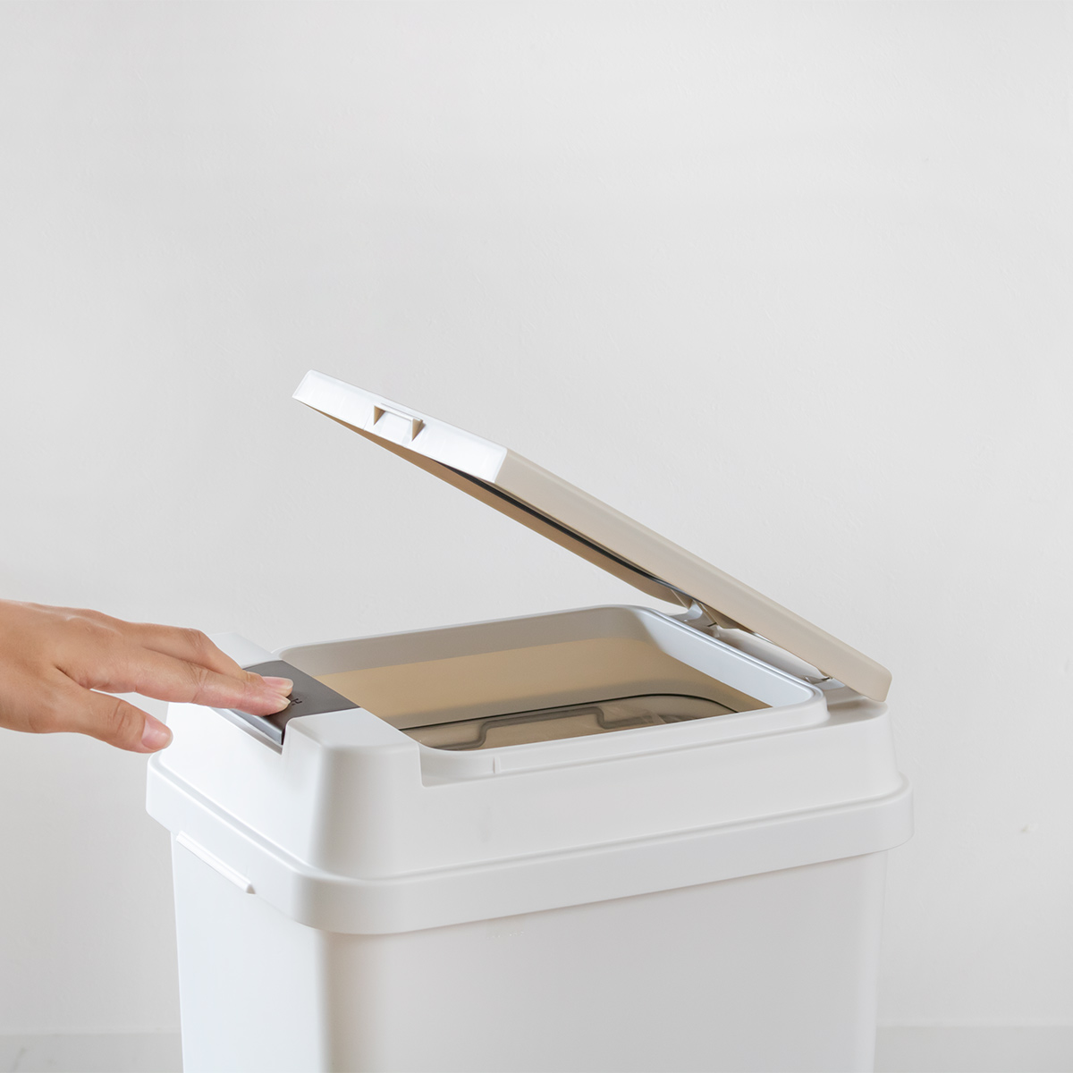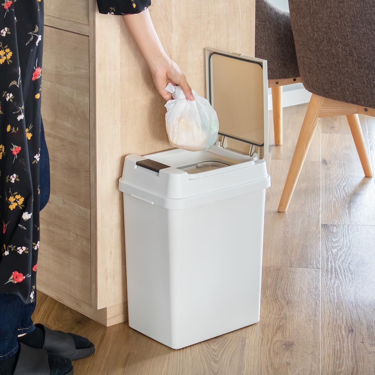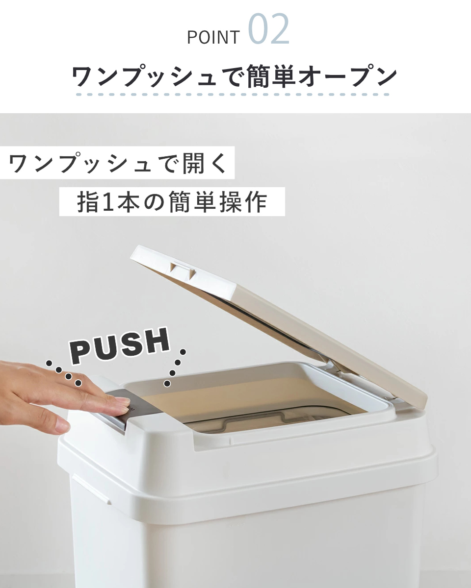 ボタンを押すだけで開くワンプッシュオープン式を採用。片手がふさがっていても簡単に開けられるので、調理中や作業中もゴミ捨てスムーズです。