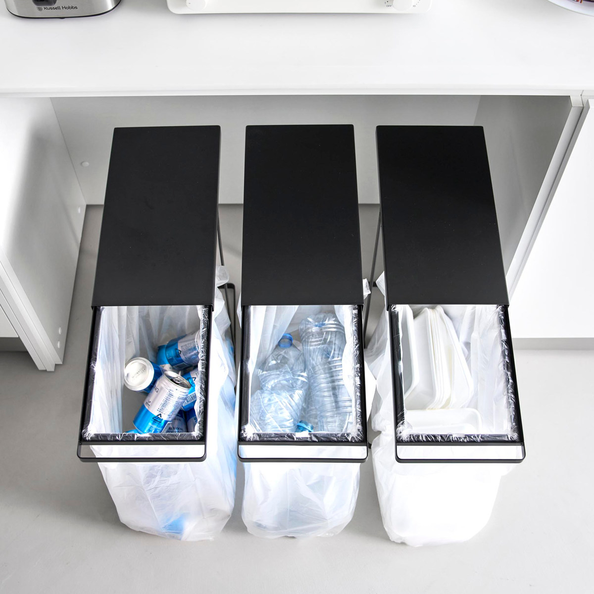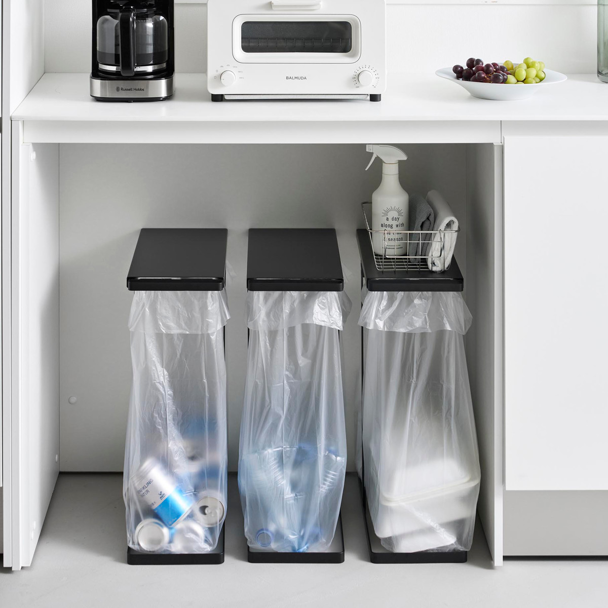 引き出すだけのスマート開閉で使いやすい、分別ゴミ袋ホルダーです。引き出し式なので、蓋を開けるスペースがないカウンター下や棚下にも設置できて便利です。