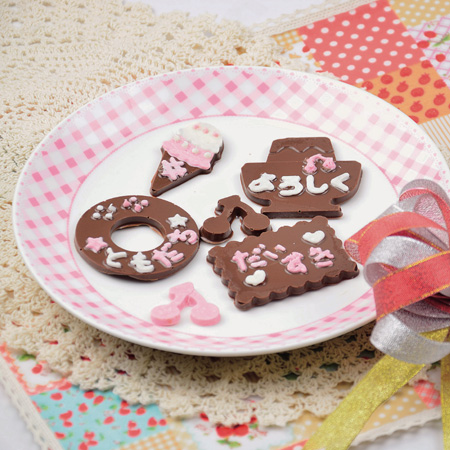 ●メッセージ「ともだち」「だいすき」「よろしく」の3種類が1個づつと、クレープ型1個、さくらんぼ型1個、アイスクリーム型1個を作ることができます。