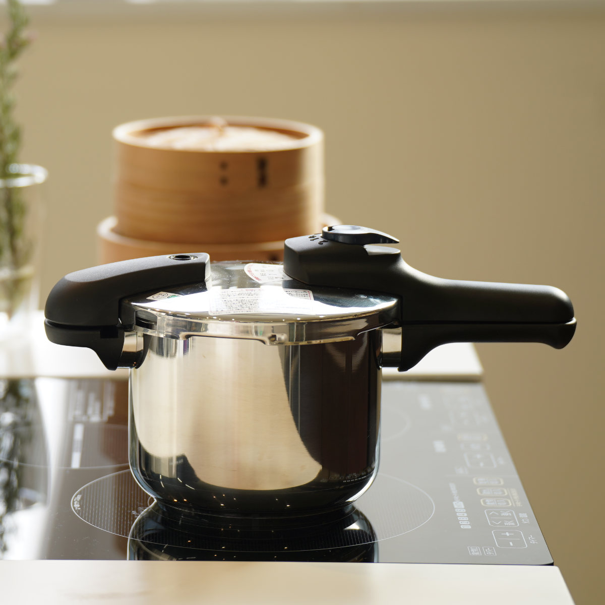 食材や調理方法に合わせて、低圧・高圧の2段階に圧力が切り替えられます。魚や野菜など煮崩れしやすい食材には低圧(60kPa)、肉の塊など芯まで熱の通りづらい食材には高圧(100kPa)と、料理に合わせてお好みの圧力を選べます。