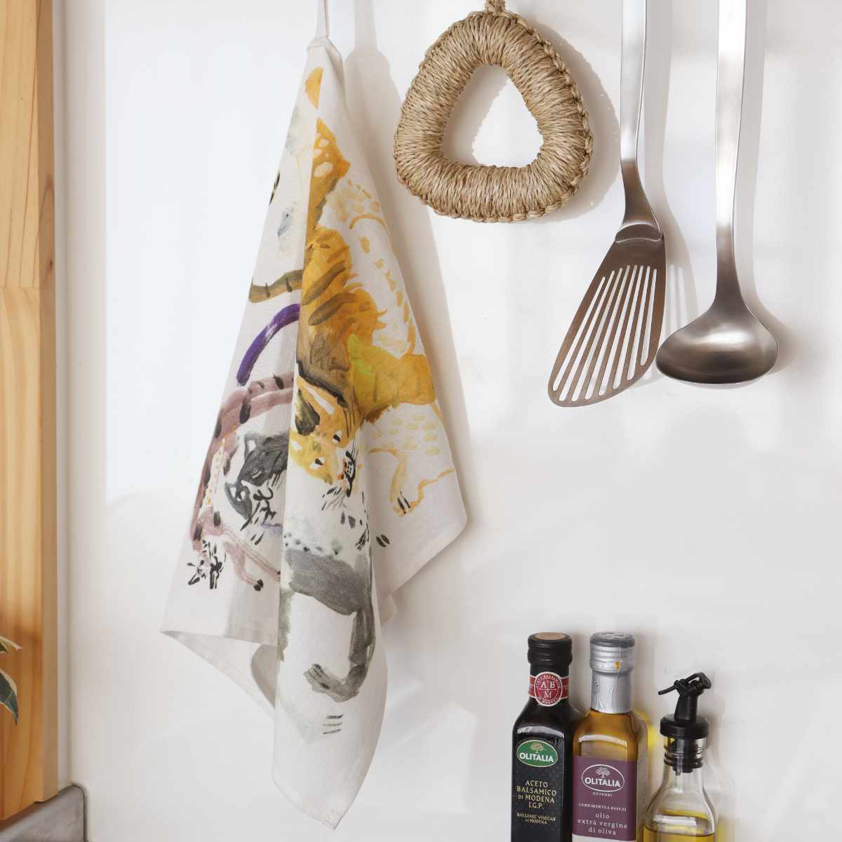 「アトリエ KOTETSU」の愛らしい猫たちのイラストが目を引く、キッチンを明るく彩るキッチンクロスです。タペストリーとして飾っても、空間に華やかさを添えてくれます。毎日の家事をちょっと楽しくしてくれる、実用性とデザイン性を兼ね備えた一枚です。