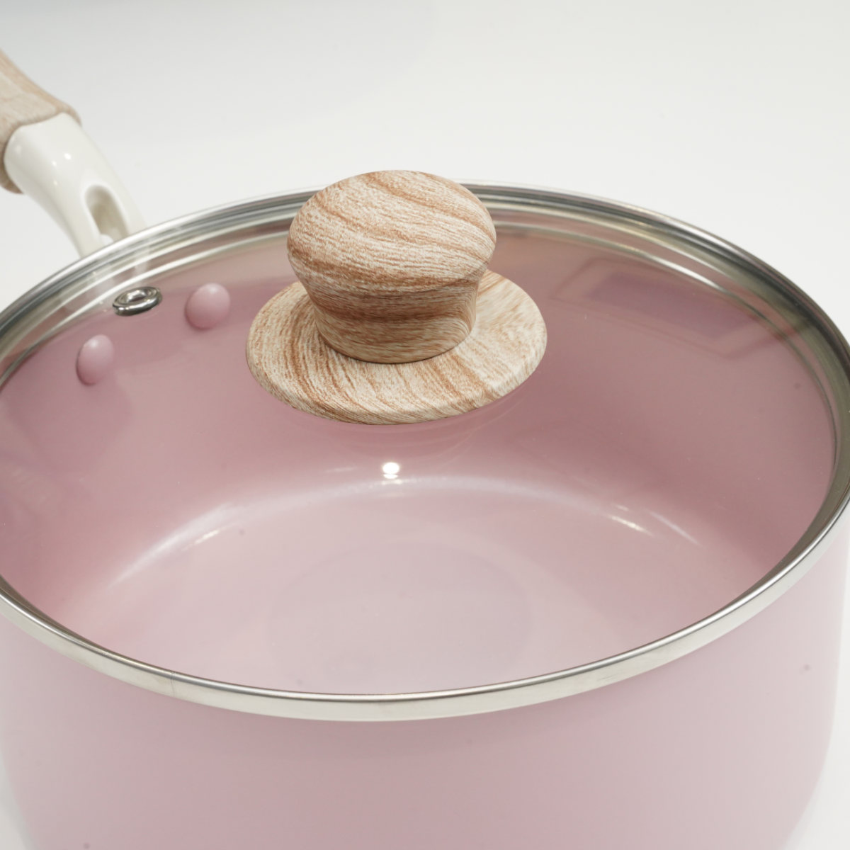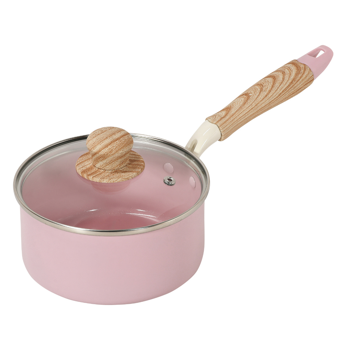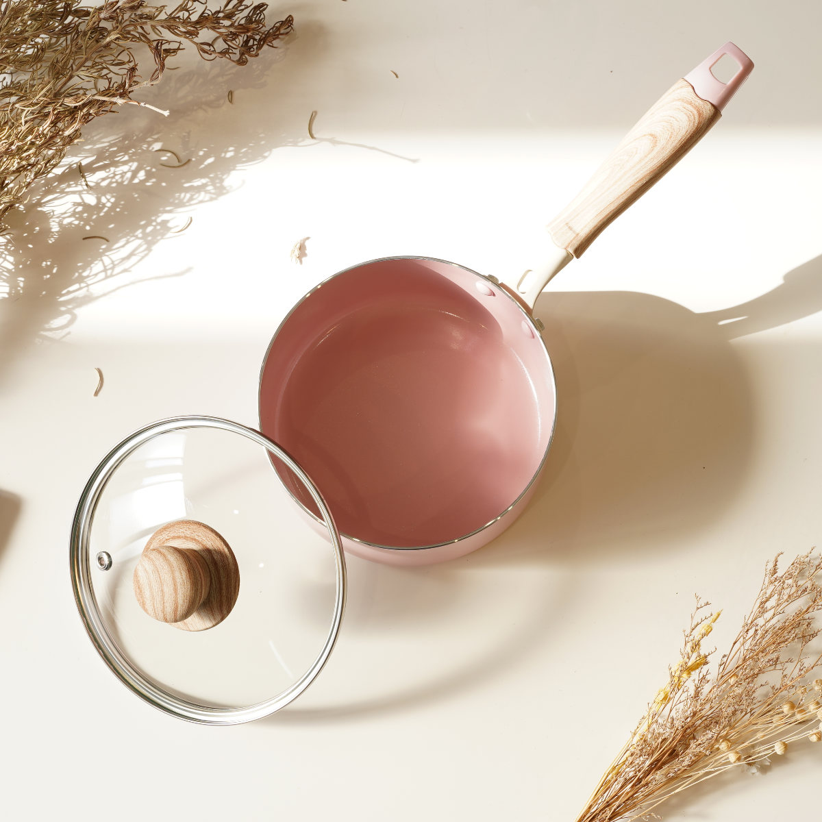 片手鍋 16cm IH対応 ガラス蓋付き セラミック ハルミック ( ガス火対応 片手なべ 鍋 セラミック加工 軽い 16センチ アルミ製 木目調ハンドル こびりつきにくい 軽量 耐久性 おしゃれ ) 【ペールピンク】