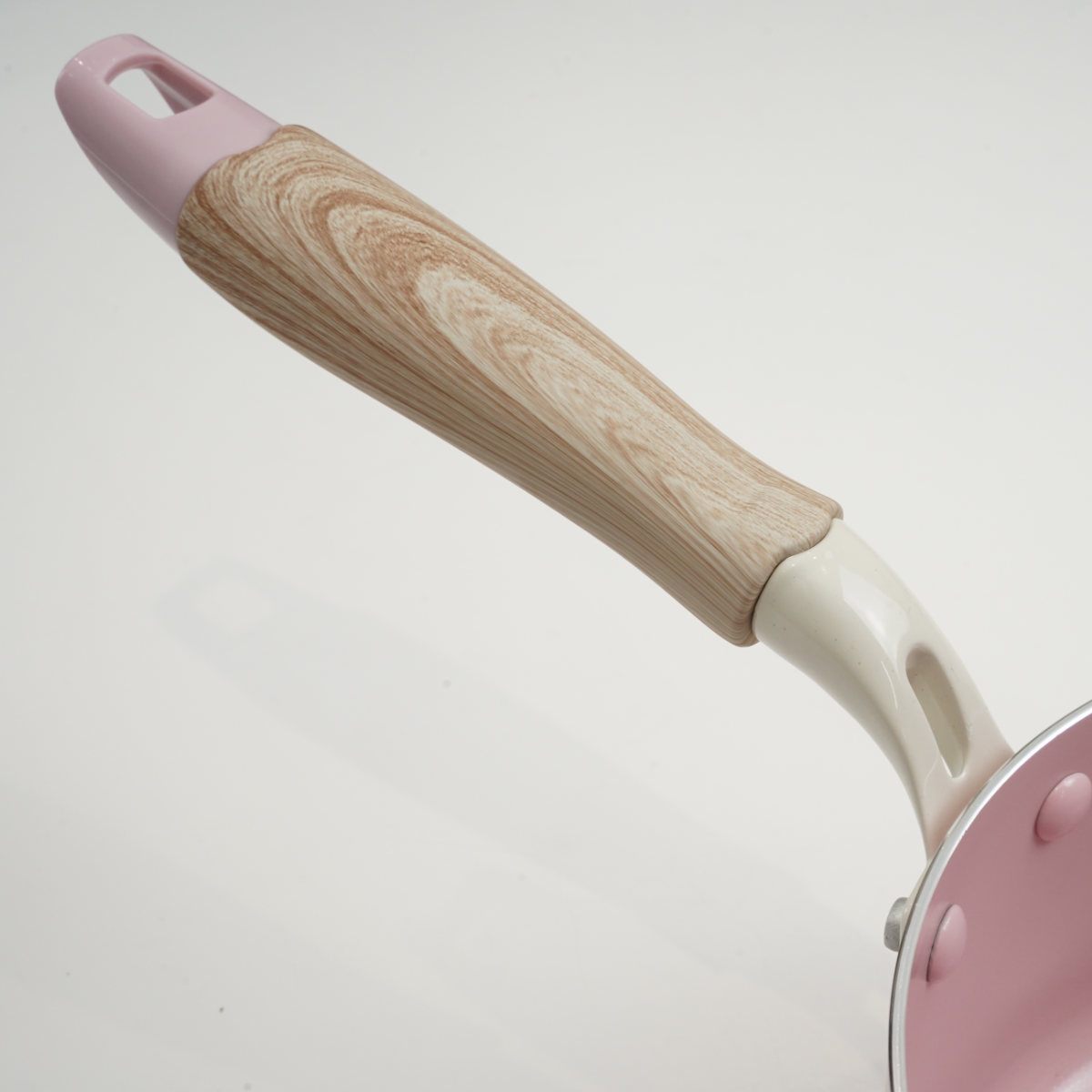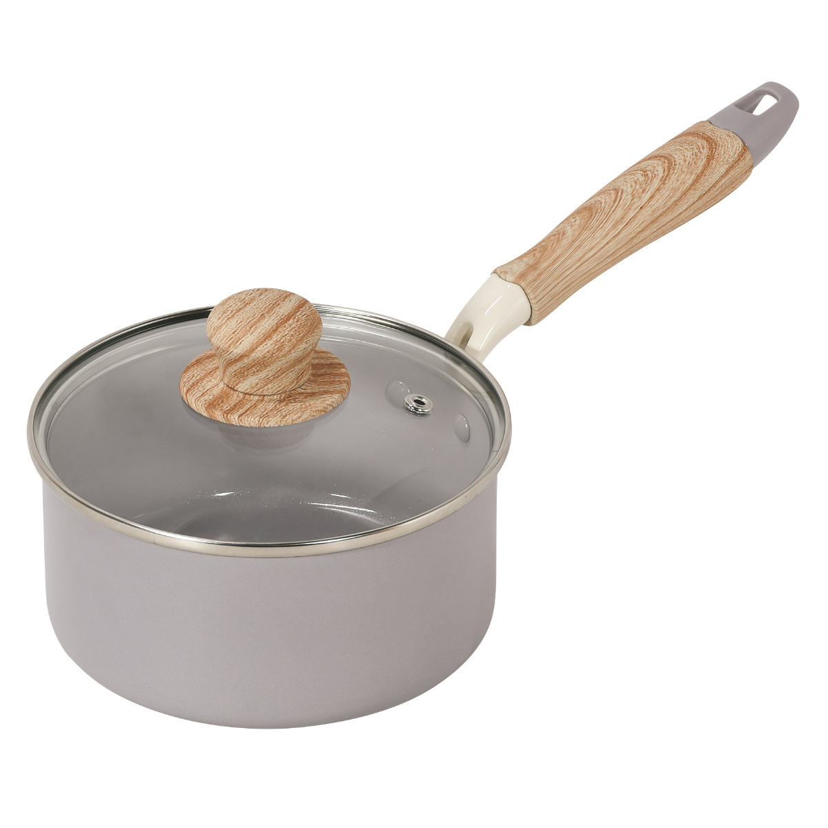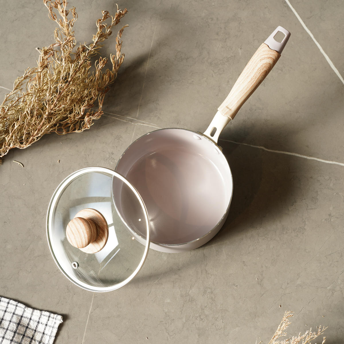 片手鍋 16cm IH対応 ガラス蓋付き セラミック ハルミック ( ガス火対応 片手なべ 鍋 セラミック加工 軽い 16センチ アルミ製 木目調ハンドル こびりつきにくい 軽量 耐久性 おしゃれ ) 【ペールピンク】