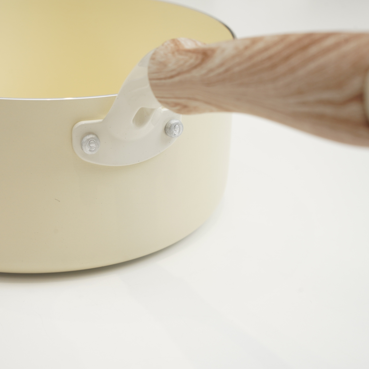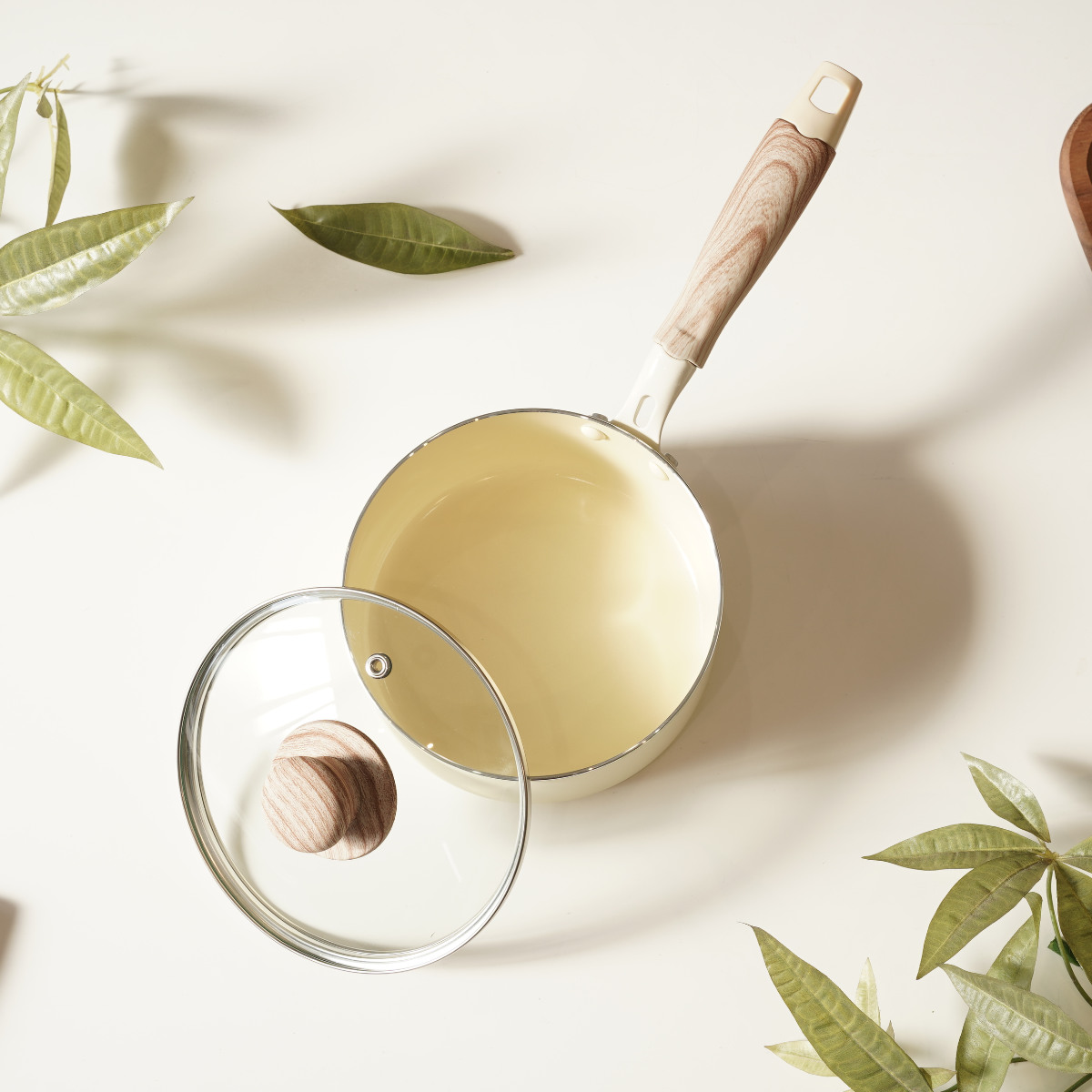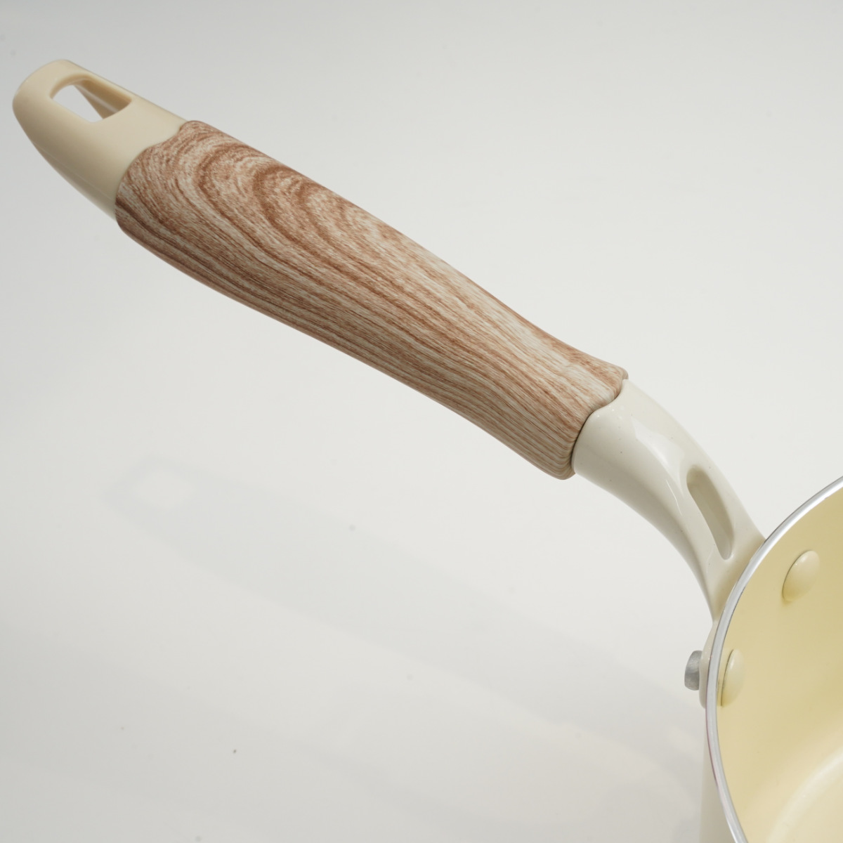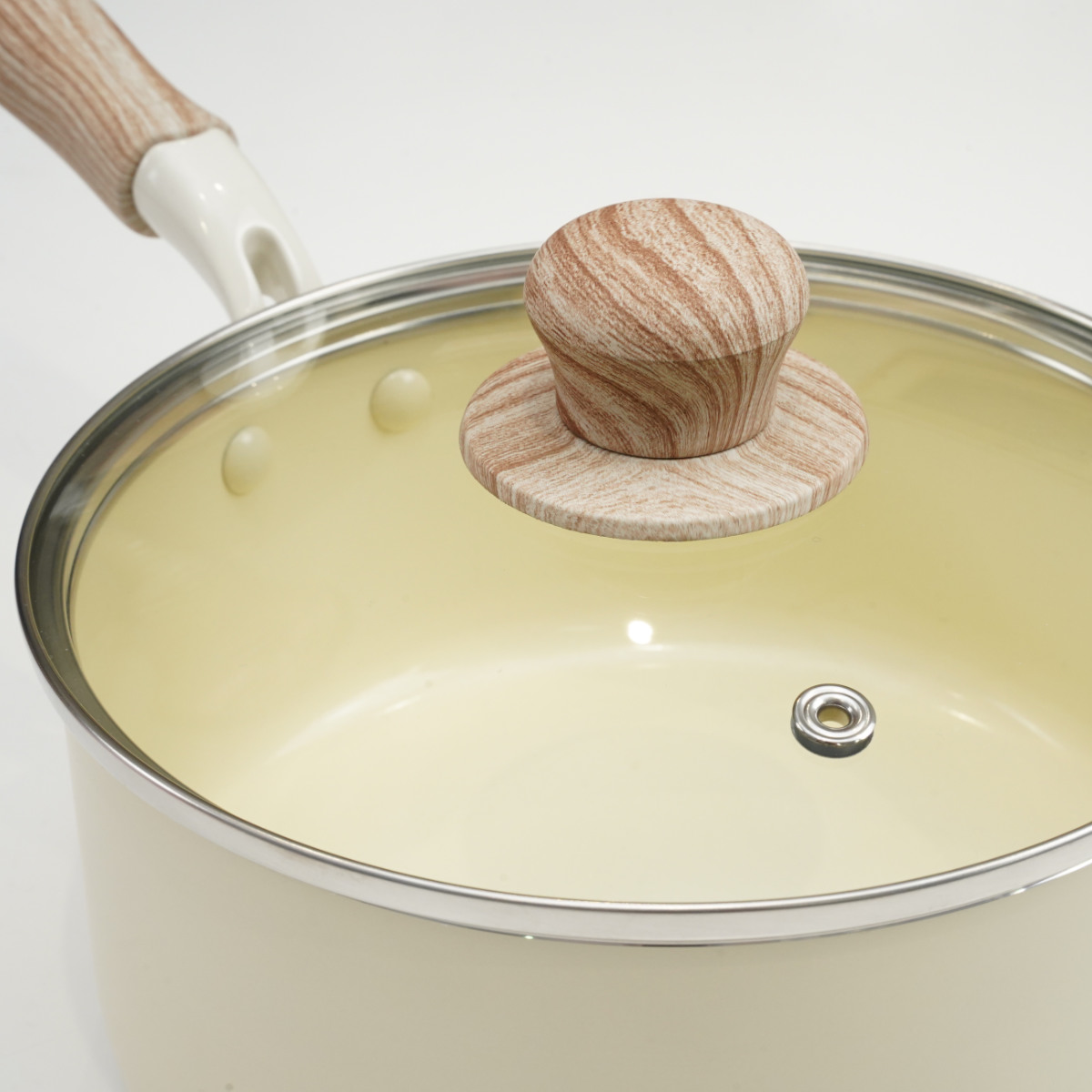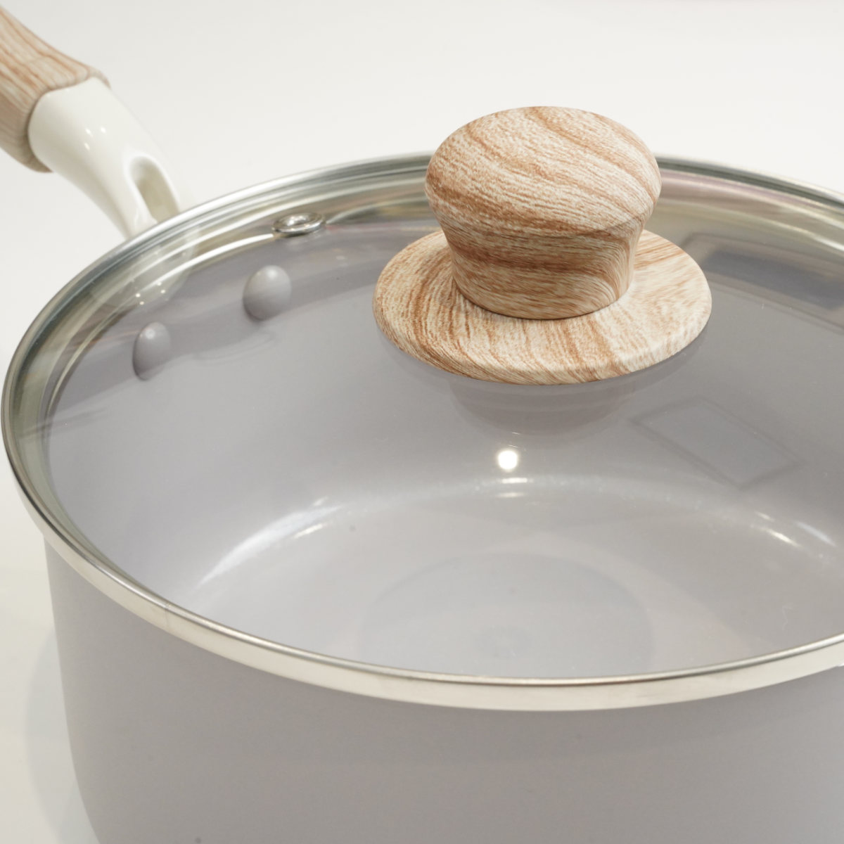 やさしい風合いの木目調ハンドルは、手になじんで持ちやすいです。蓋のつまみも木目調で、キッチンに温かみのある雰囲気を添えます。