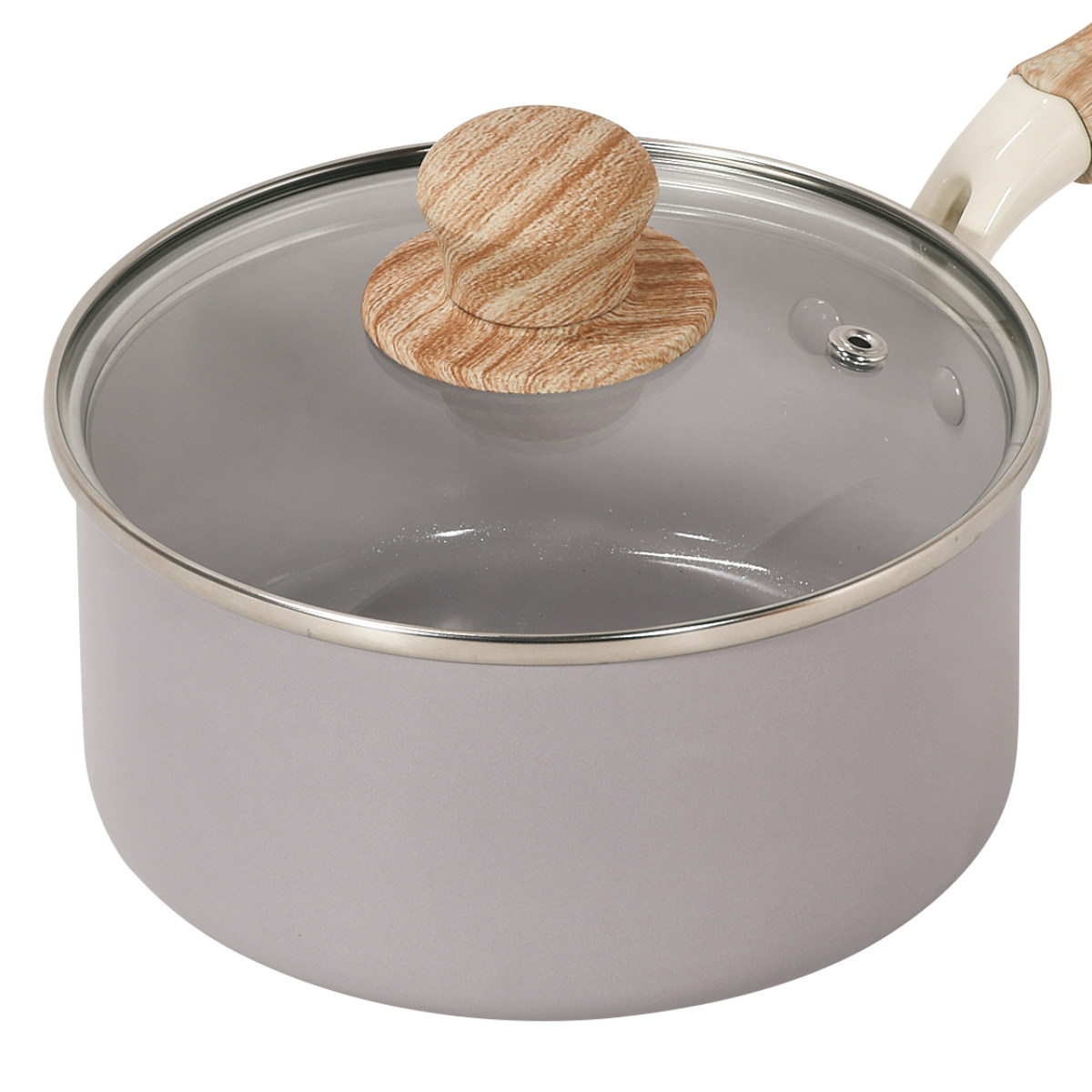 やさしい風合いの木目調ハンドルは、手になじんで持ちやすいです。蓋のつまみも木目調で、キッチンに温かみのある雰囲気を添えます。