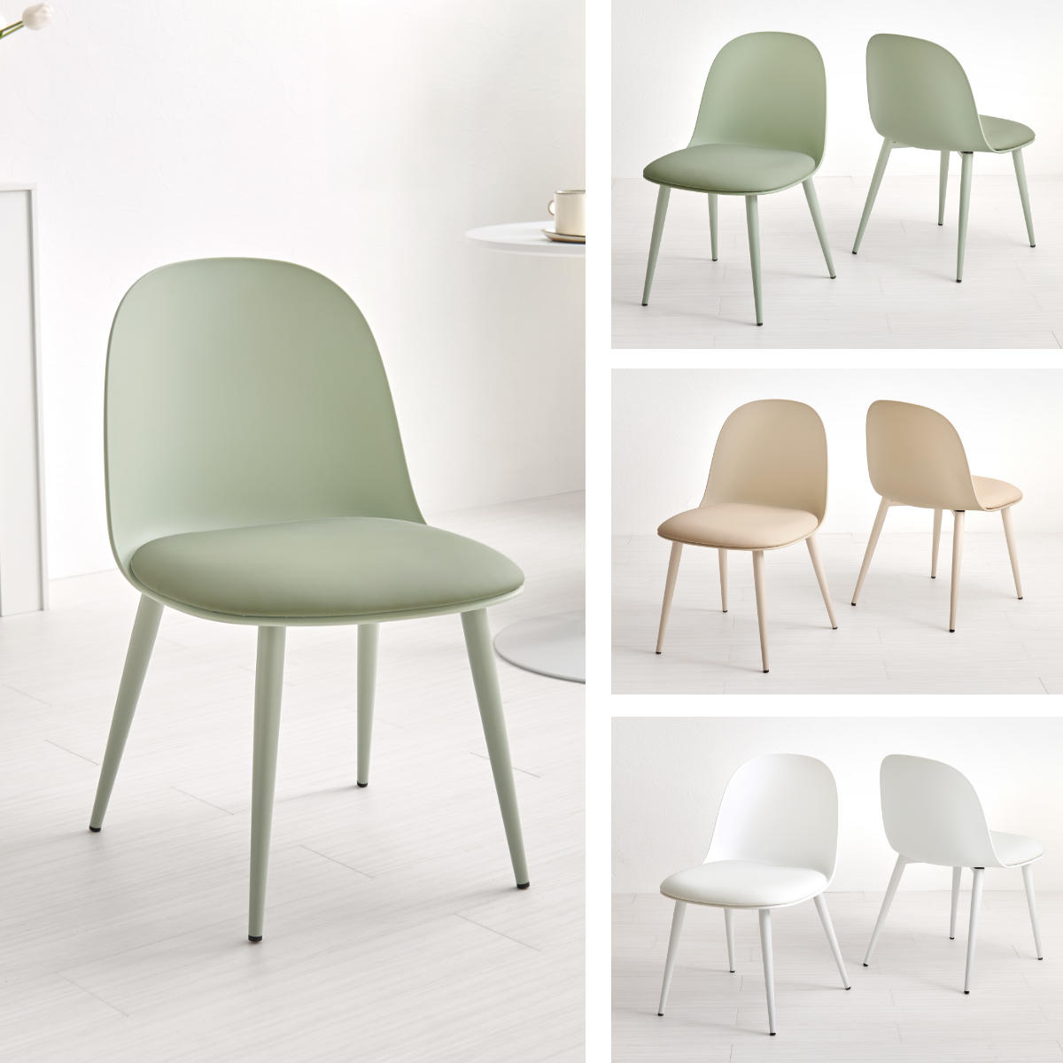 くすみカラーと柔らかな丸いフォルムが調和したデザインです。座面に合わせて脚もカラーコーティングされ、マットな質感が空間にやさしい雰囲気を添えます。同色2脚セットなので、並べて置くだけで統一感のあるコーディネートが完成します。