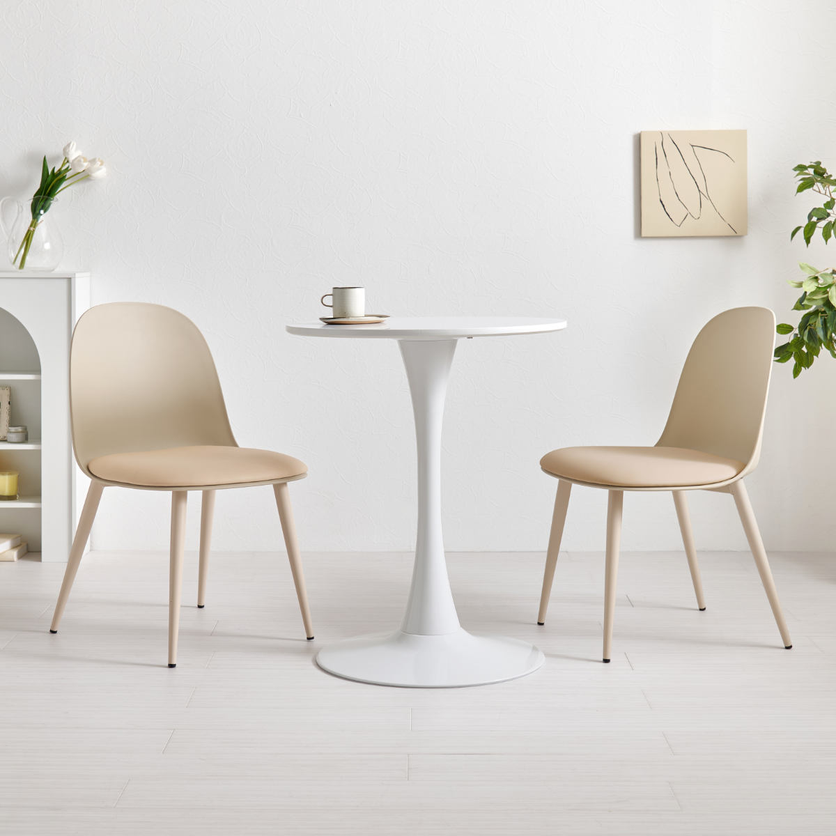 やさしい丸型のカフェテーブルとチェア同色2脚のセットです。テーブル天板は上品なマーブル柄と清潔感のあるホワイトの2種類、チェアはくすみカラーの3色から選択可能。丸い天板と柔らかなフォルムのチェアが空間をやさしく彩り、2人での食事やティータイムを心地よい時間にしてくれます。