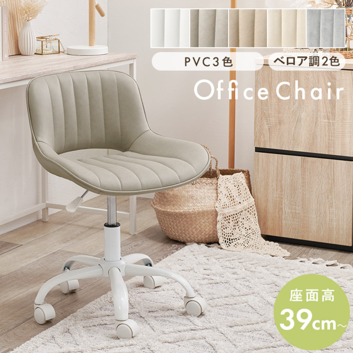 オフィスチェア 座面高39~47cm ベロア調 PVC生地 昇降式 回転 ( ワークチェア パソコンチェア 低め 高さ調節 キャスター付き 学習チェア 勉強椅子 チェア レザー調 ウレタン 360度回転 イス 椅子 いす 肘なし ) 【PVCベージュ】