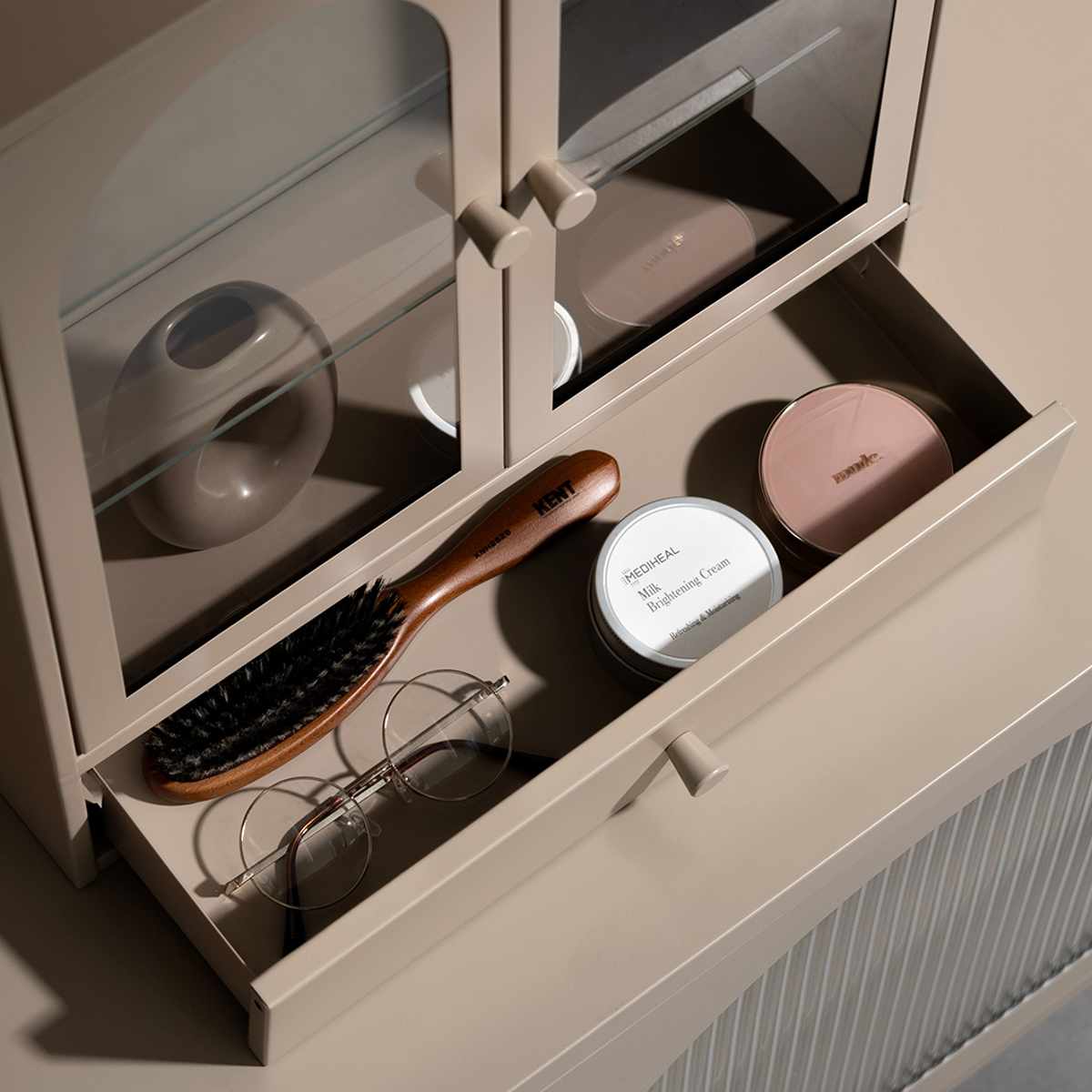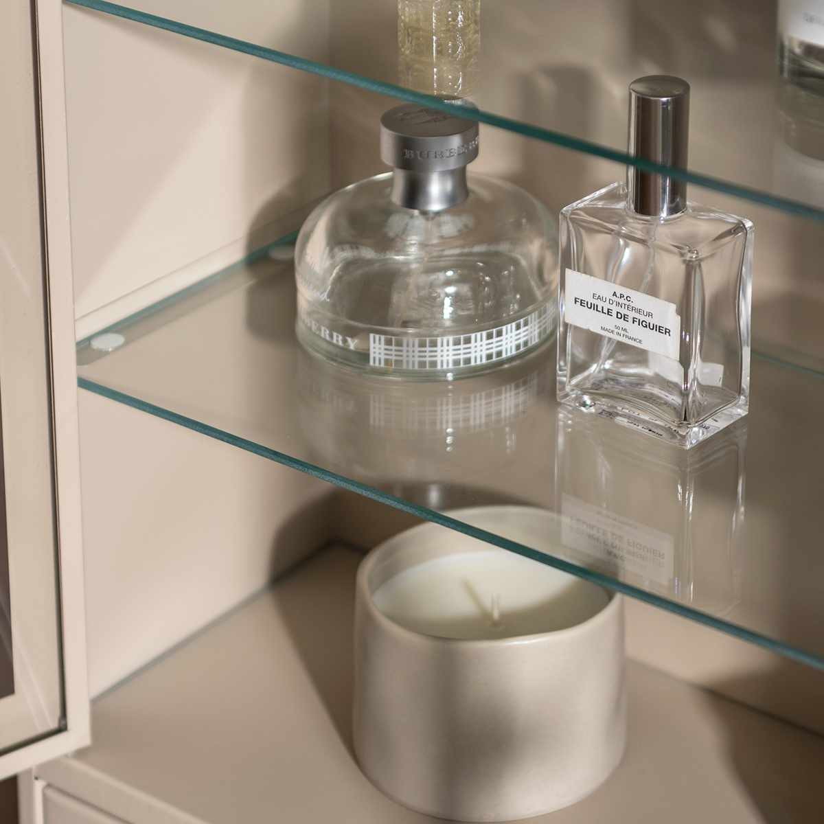 フレームには耐久性に優れたスチール、扉と棚板には丈夫な強化ガラスを採用。 お気に入りの小物をディスプレイしながら、ほこりからも保護してくれます。
