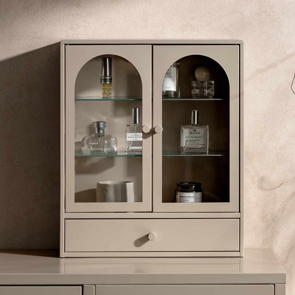 見せる収納を楽しむディスプレイケースです。引出し付きで、雑多な小物も隠してスマートに収納可能。クラシカルなアーチデザインが、空間に奥行きと上品な存在感を演出します。